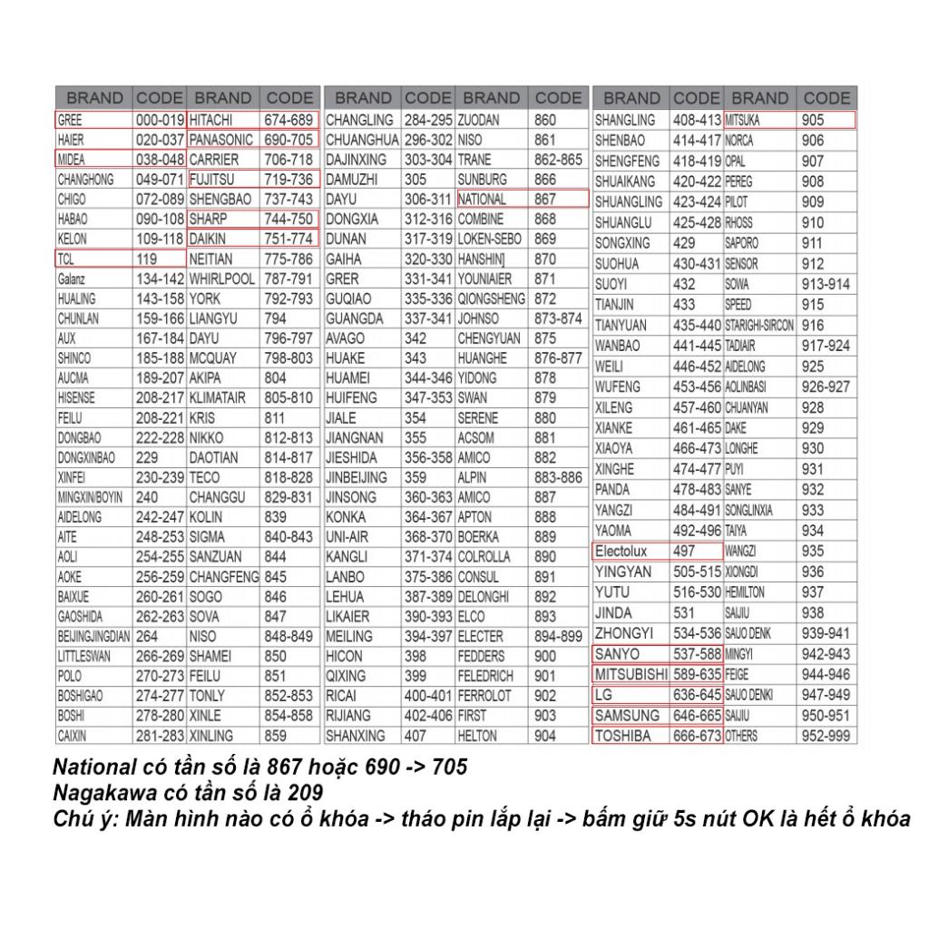 Thông số kỹ thuật: Tần số của các loại máy Nhãn hiệu - Tần số cho Haier - 20-37 cho Daikin - 751-774 cho Electrolux - 497 cho Fujisu - 719-736 cho Gree - 0-19 cho Hitachi - 674-689 cho LG - 636-645 cho Mítubishi - 589-635 cho Panasonic 690-705 cho Samsung - 646-665 cho Sanyo - 537-588 cho Sharp - 744-750 cho TCL - 119 cho Toshiba - 666-673
