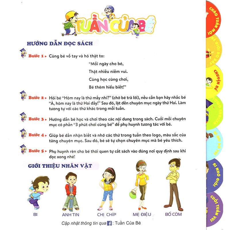 Combo gồm 4 cuốn Tuần của bé dành cho các bé sinh từ ngày 23/9 đến 22/10 thuộc cung Thiên Bình nhé! Đó là các cuốn: Bé tài năng - Bé sâu sắc - Bé lắng nghe - Bé quyết đoán Bộ sách được biên soạn theo nội dung chương trình giáo dục dành cho lứa tuổi mầm non từ 3-6 tuổi. Nội dung mỗi cuốn được chia theo từng ngày trong tuần: 7 chuyên mục tương ứng với 7 ngày trong tuần, giúp trẻ không nhàm chán vì phụ huynh có thể tương tác cùng con các nội dung khác nhau mỗi ngày. Cụ thể nội dung mỗi ngày như sau: Thứ Hai - Chào tuần mới: Khám phá về thiên nhiên và các hoạt động của bé; Thứ Ba - Thế giới đó đây: Tìm hiểu về các nét văn hoá độc đáo của các nước trên thế giới; khám phá về động thực vật và các hiện tượng tự nhiên; Thứ Tư - Chuyện kể: Mỗi cuốn là 1 câu chuyện kể cho bé nghe; Thứ Năm- Towo English: Mỗi cuốn sẽ dạy cho bé làm quen 2 từ vựng tiếng Anh theo chủ đề qua câu thoại đơn giản, dễ nhớ; Thứ Sáu- Bí kíp bỏ túi: Những kĩ năng sống cần thiết cho trẻ; Thứ Bảy - Ai nhớ giỏi hơn: Các bài thơ, bài hát, câu đó dành cho bé; Chủ nhật - Cuối tuần vui: Các trò chơi cùng bé hoặc hướng dẫn bé làm đồ chơi; Khổ sách: 23x23 cm Sách có hình dán decal cho bé thoả trí sáng tạo.