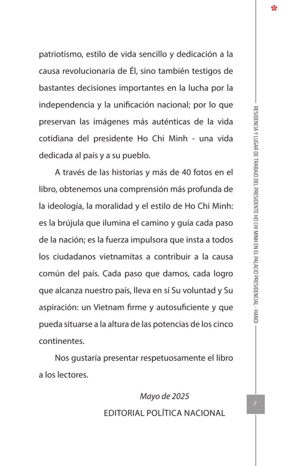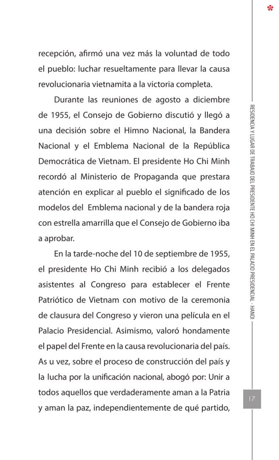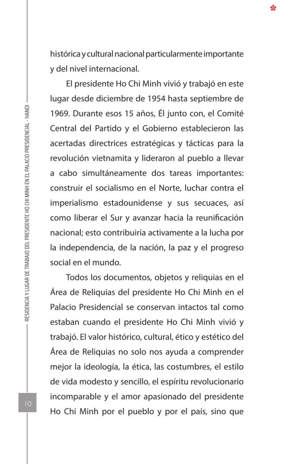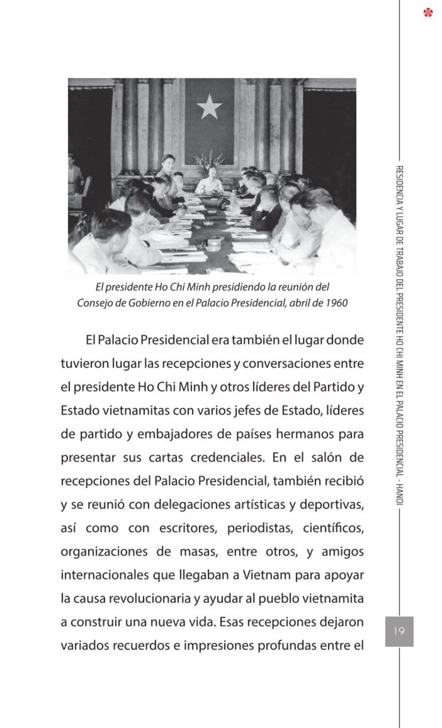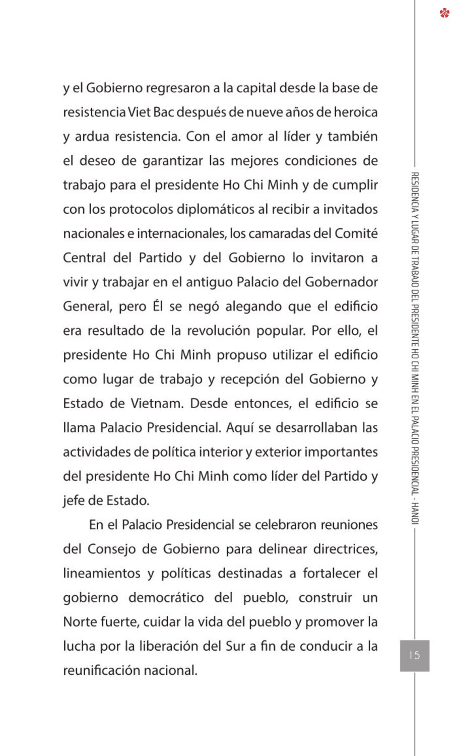 El libro Residencia y lugar de trabajo del presidente Ho Chi Minh en el Palacio Presidencial - Hanoi ofrece a los lectores un recurso valioso que nos ayuda a comprender mejor la vida del amado líder del de la nación vietnamita. El libro recrea de forma realista y lleva al lector a cada pequeño rincón, a cada recuerdo, a cada historia sencilla pero impregnada de significado histórico y humano sobre los lugares asociados al presidente Ho Chi Minh en el Palacio Presidencial como: la Casa 54, la Casa sobre pilotes, la Casa 67, el estanque de peces, el camino de mangos, lentre otros.