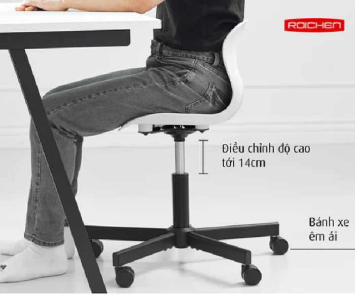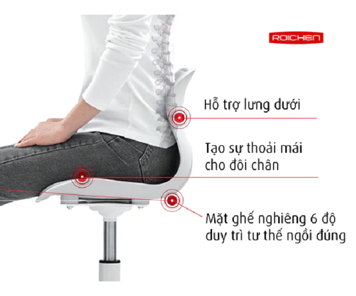 Ghế chỉnh dáng ngồi đúng có chân xoay từ thương hiệu Roichen Hàn Quốc được thiết kế giúp cho người dùng duy trì tư thế ngồi đúng một cách thoải mái, vững chãi, đưa cột sống quay trở về đường cong sinh lý. Điều này giúp ngăn ngừa các bệnh văn phòng do ngồi nhiều như đau lưng, cổ, vai, gáy...Hoặc thiếu tập trung khi học tập và làm việc do tư thế ngồi chưa đúng.