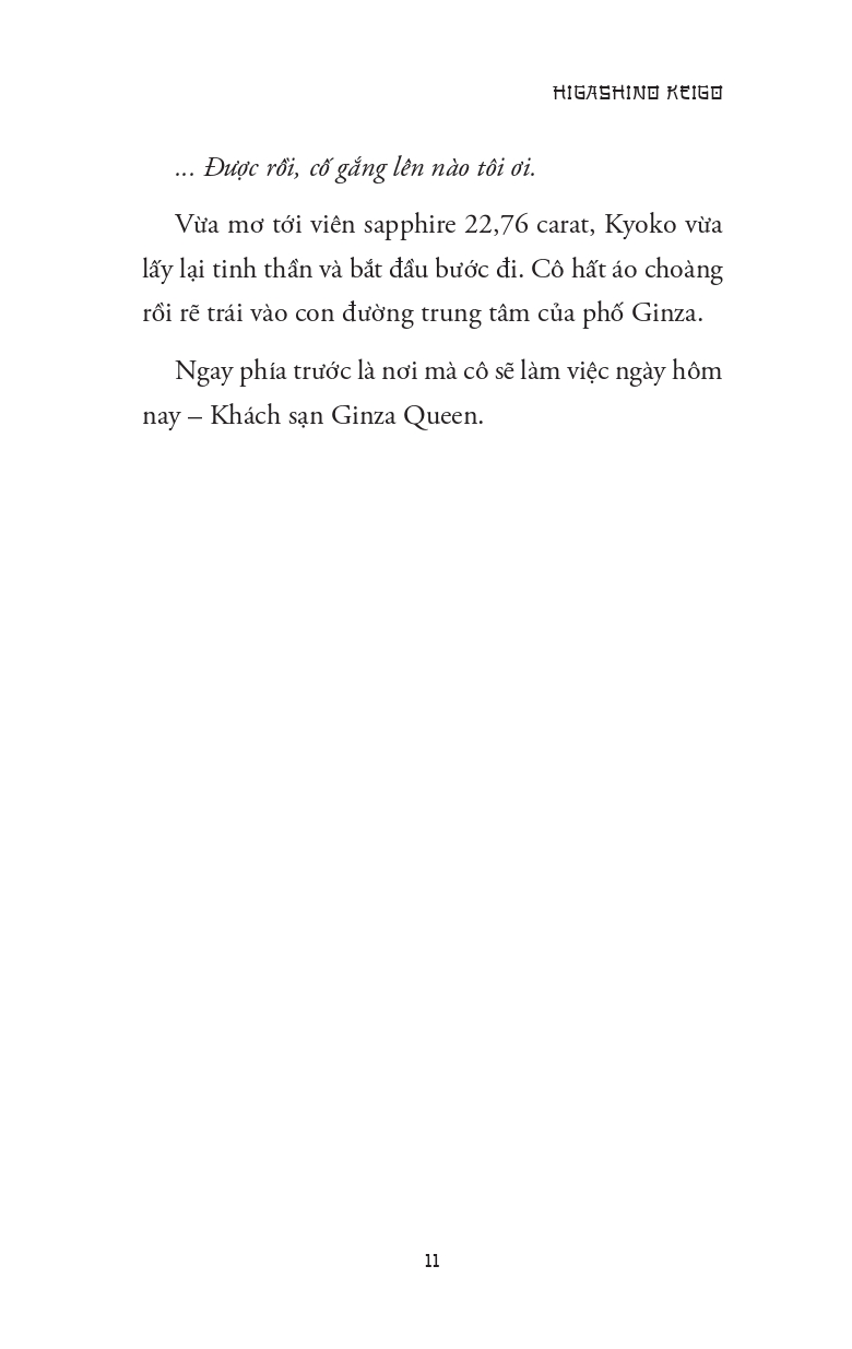 Tác giả: Higashino Keigo (4.2.1958) là một trong những tác giả tiểu thuyết trinh thám được nhiều người biết đến nhất ở châu Á và được cho là tiểu thuyết gia Nhật Bản nổi tiếng nhất tại Trung Quốc. Ông từng là Chủ tịch thứ 13 của Hiệp hội Nhà văn Trinh thám Nhật Bản từ năm 2009 đến 2013 và giành được nhiều giải thưởng văn học lớn, với gần hai mươi cuốn sách đã được chuyển thể thành phim điện ảnh và truyền hình. Các tác phẩm tiêu biểu của ông bao gồm: Bunshin, Byakuyakou, Genya, Kokushou Shousetsu, loạt truyện Masquerade Hotel, Hakuchou to Koumori, Toumei na Rasen và nhiều tác phẩm khác.