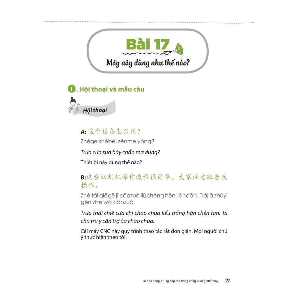 Cuốn sách “Tự học Tiếng Trung cấp tốc trong công xưởng, nhà máy” ra đời cũng vì mục đích đó. Với các chủ đề đa dạng, từ giao tiếp thông dụng tới giao tiếp theo chuyên ngành, cuốn sách sẽ phù hợp cho nhiều đối tượng khác nhau, đặc biệt là những người bận rộn muốn học tiếng Trung có trọng điểm, tiết kiệm thời gian và có thể ứng dụng ngay trong công việc.