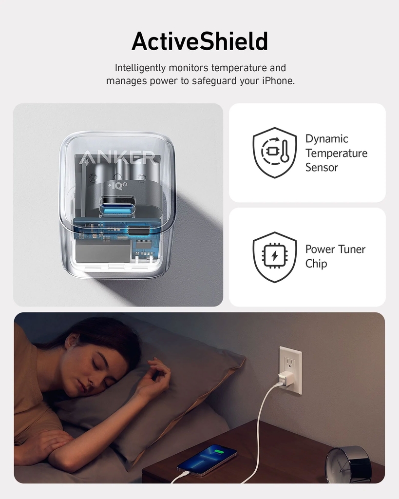 Giới thiệu Củ Sạc Nhanh 1C ANKER Zolo A2699 20W (Ice-Cooled Chip, Al Temperature Control, Aerospace Grade GaN, Ultra-low Temperature, Anker’s MultiProtect Superior Safety system) Thông số kỹ thuật - Kích thước: 32 x 31.5 x 36mm
