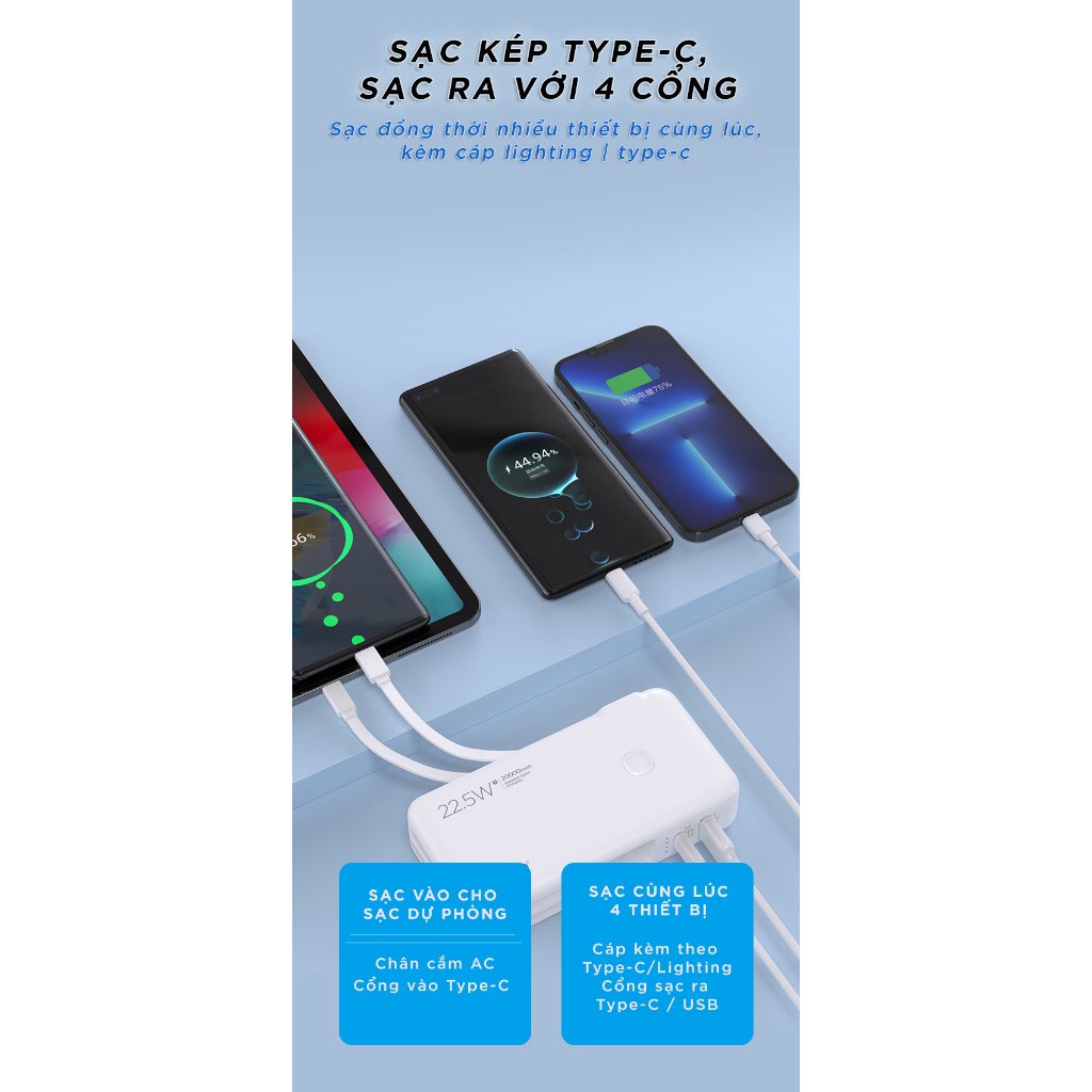 Sạc dự phòng dung lượng lớn 20000mAh, hỗ trợ đa giao thức sạc nhanh, phù hợp với 99% các thiết bị thông minh trên thị trường với công suất sạc ra tối đa 22.5W. Sạc được trang bị IC thông minh, tự điều chỉnh dòng điện, sạc nhanh an toàn, không hại pin, bảo vệ thiết bị hiệu quả.