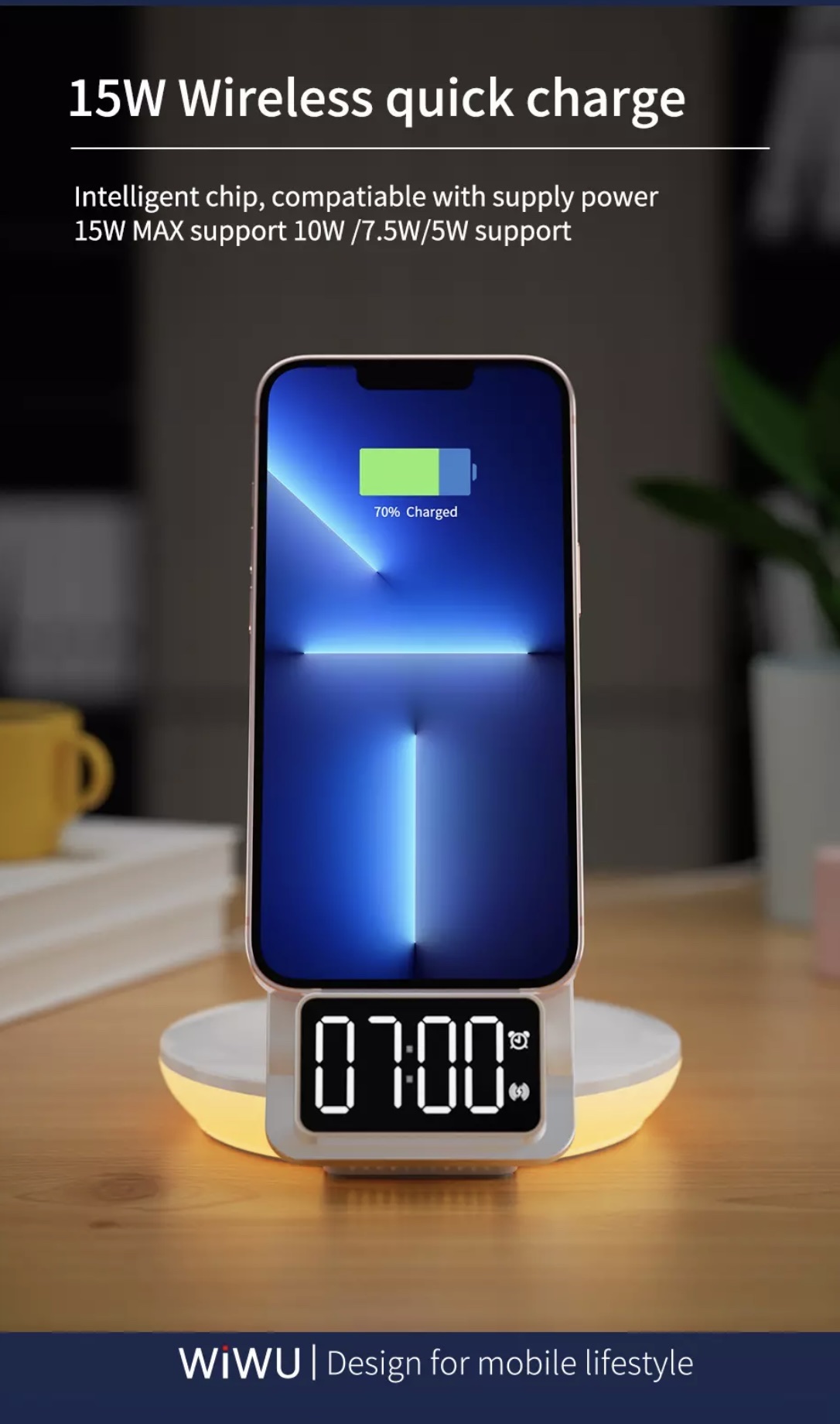 Sạc Wiwu Automatic Positioning 4 in 1 M11 Thương hiệu: Wiwu Mô tả sản phẩm - Chất liệu: hợp kim nhôm chất lượng cao và bền - Bộ sạc không dây 4 in 1 và là giá đỡ để bàn cho điện thoại - Hỗ trợ sạc không dây nhanh - Cuộn dây có thể tháo rời, ngang và dọc - Định vị chính xác - Sạc có chế độ đèn ban đêm ánh sáng dịu nhẹ và thoải mái - Xung quanh sạc ánh sáng ấm áp và sáng sủa - Điều chỉnh đa hướng sử dụng trong nhiều tình huống - Sạc có đồng hồ hiển thị giờ - Hỗ trợ cho tất cả các máy có chế độ sạc không dây. Bộ chuyển đổi dành cho di động 4.7- 6.9inch - Đầu ra: 5V = 3A 9V = 2.3A - Giao diện: loại C - Tỉ lệ đầu ra: 15W ( hỗ trợ 10W/7,5W,5W)
