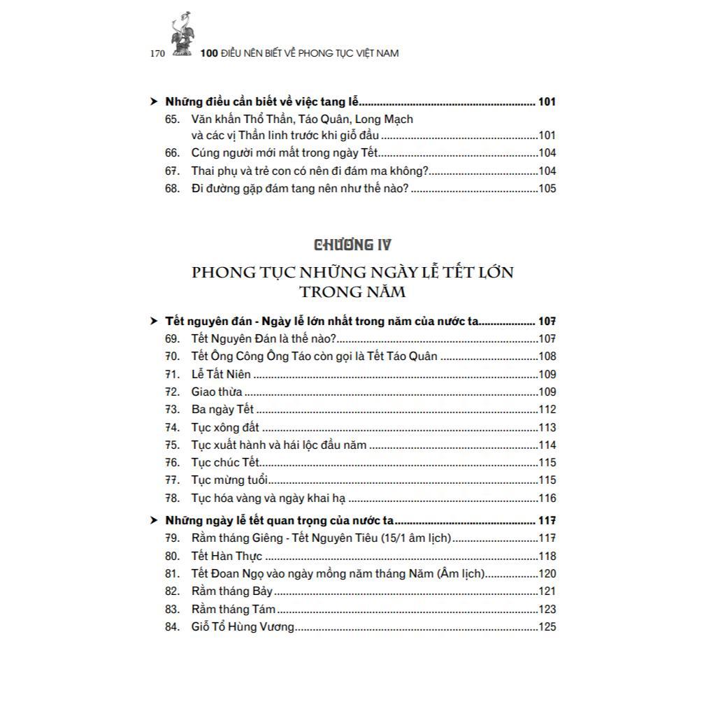 100 Điều Nên Biết Về Phong Tục Việt Nam giới thiệu một số phong tục, tập tục trong hiếu hỷ hay những ngày lễ tết lớn tiêu biểu nhất của Việt Nam. Hơn nữa, cuốn sách còn giới thiệu một số những tục lệ hay, những ngày lễ của các vùng miền và một số dân tộc tiêu biểu. Hầu hết các phong tục vẫn được duy trì đến ngày hôm nay, nhưng một số phong tục bị mai một đi theo thời gian và một số khác được chắt lọc hoặc được kết hợp với nhau cho phù hợp với xã hội hiện đại.