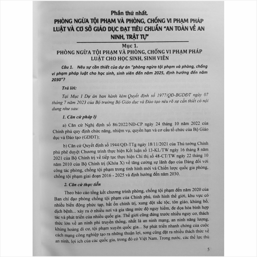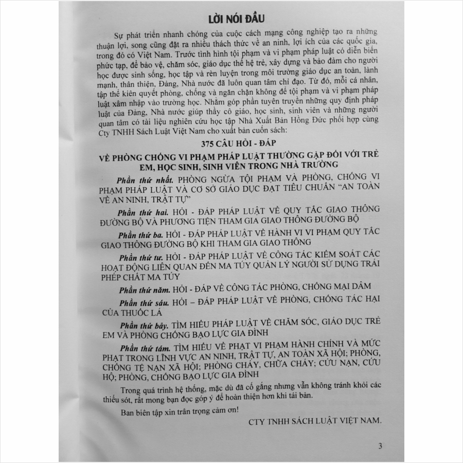 - Toàn bộ sách bìa mềm khổ lớn 19 x 27 cm phân phối bởi Nhà sách Nam Việt đều được bọc sách Plastic MIỄN PHÍ và xuất hóa đơn điện tử đầy đủ, nhanh chóng. …//… Sự phát triển nhanh chóng của cuộc cách mạng công nghiệp tạo ra những thuận lợi, song cũng đặt ra nhiều thách thức về an ninh, lợi ích của các quốc gia, trong đó có Việt Nam. Trước tình hình tội phạm và vi phạm pháp luật có diễn biến phức tạp, để bảo vệ, chăm sóc, giáo dục thế hệ trẻ, xây dựng và bảo đảm cho người học được sinh sống, học tập và rèn luyện trong môi trường giáo dục an toàn, lành mạnh, thân thiện, Đảng, Nhà nước đã luôn quan tâm chỉ đạo. Từ đó, mỗi cá nhân, tập thể kiên quyết phòng, chống và ngăn chặn không để tội phạm và vi phạm pháp luật xâm nhập vào trường học. Nhằm góp phần tuyên truyền những quy định pháp luật của Đảng, Nhà nước giúp thầy cô giáo, học sinh, sinh viên và những người quan tâm có tài liệu nghiên cứu học tập. Nhà sách Nam Việt xin trân trọng giới thiệu cuốn sách: 375 Câu Hỏi Đáp Về Phòng Chống Vi Phạm Pháp Luật Thường Gặp Đối Với Trẻ Em, Học Sinh, Sinh Viên Trong Nhà Trường …//… Nội dung sách gồm 8 phần sau: Phần I. PHÒNG NGỪA TỘI PHẠM VÀ PHÒNG, CHỐNG VI PHẠM PHÁP LUẬT VÀ CƠ SỞ GIÁO DỤC ĐẠT TIÊU CHUẨN “AN TOÀN VỀ AN NINH, TRẬT TỰ” Phần II. HỎI – ĐÁP PHÁP LUẬT VỀ QUY TẮC GIAO THÔNG ĐƯỜNG BỘ VÀ PHƯƠNG TIỆN THAM GIA GIAO THÔNG ĐƯỜNG BỘ Phần III. HỎI – ĐÁP PHÁP LUẬT VỀ HÀNH VI VI PHẠM QUY TẮC GIAO THÔNG ĐƯỜNG BỘ KHI THAM GIA GIAO THÔNG Phần IV. HỎI – ĐÁP PHÁP LUẬT VỀ CÔNG TÁC KIỂM SOÁT CÁC HOẠT ĐỘNG LIÊN QUAN ĐẾN MA TUÝ QUẢN LÝ NGƯỜI SỬ DỤNG TRÁI PHÉP CHẤT MA TUÝ Phần V. HỎI – ĐÁP VỀ CÔNG TÁC PHÒNG, CHỐNG MẠI DÂM Phần VI. HỎI – ĐÁP PHÁP LUẬT VỀ PHÒNG, CHỐNG TÁC HẠI CỦA THUỐC LÀ Phần VII. TÌM HIỂU PHÁP LUẬT VỀ CHĂM SÓC, GIÁO DỤC TRẺ EM VÀ PHÒNG CHỐNG BẠO LỰC GIA ĐÌNH Phần VIII. TÌM HIỂU VỀ PHẠT VI PHẠM HÀNH CHÍNH VÀ MỨC PHẠT TRONG LĨNH VỰC AN NINH, TRẬT TỰ, AN TOÀN XÃ HỘI; PHÒNG, CHỐNG TỆ NẠN XÃ HỘI; PHÒNG CHÁY, CHỮA CHÁY; CỨU NẠN, CỨU HỘ; PHÒNG, CHỐNG BẠO LỰC GIA ĐÌNH ...//... Cảm ơn các bạn đã ghé thăm shop Nhà sách Nam Việt ! Sách 375 Câu Hỏi Đáp Về Phòng Chống Vi Phạm Pháp Luật Thường Gặp Đối Với Trẻ Em, Học Sinh, Sinh Viên Trong Nhà Trường Sách 375 Câu Hỏi Đáp Về Phòng Chống Vi Phạm Pháp Luật Thường Gặp Đối Với Trẻ Em, Học Sinh, Sinh Viên Trong Nhà Trường