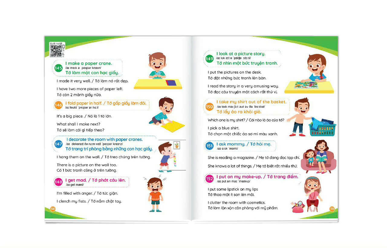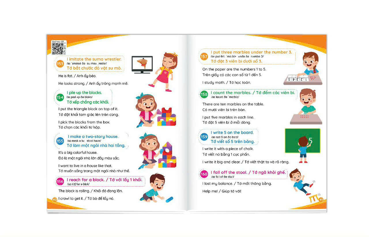 Sách 900 Câu Tiếng Anh Giao Tiếp Thường Dùng Hàng Ngày - Cẩm Nang Cho Mẹ Cùng Con Học Tiếng Anh Mỗi Ngày (Kèm File Nghe - Quét QR) GIỚI THIỆU SẢN PHẨM: Cuốn sách gồm 900 câu đàm thoại tiếng Anh để cha mẹ cùng con có thể giao tiếp về các chủ đề xung quanh cuộc sống hằng ngày, từ lúc thức dậy vào buổi sáng, đi học, đi chơi, đi siêu thị … cho đến lúc đi ngủ. Có cuốn sách này thì cha mẹ không lo bí từ, không biết nói tiếng Anh như thế nào cùng con. Đây là cuốn cẩm nang giúp cho cha mẹ có cơ hội học tập và giao tiếp tiếng Anh cùng con, để cả hai cùng tiến bộ mỗi ngày. Sách có kèm file nghe quét mã QR với giọng đọc tiếng Anh chuẩn để cha mẹ và con cùng nghe và tắm ngôn ngữ mỗi ngày. HƯỚNG DẪN BẢO QUẢN SÁCH THIẾU NHI: