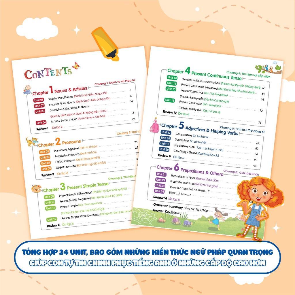 - Sách gồm 6 chương với 24 Unit, tổng hợp tất cả những chủ đề ngữ pháp hay nhất trong chương trình lớp 3 như: Danh từ & Mạo từ, Đại từ, động từ To-be, …Những kiến thức ngữ pháp nên tảng vững chắc đầu tiên này sẽ giúp con phát huy tối đa khả năng tiếng Anh khi lên những lớp cao hơn. ần thực hành cung cấp đa dạng các hoạt động, giúp các con tiếp cận từng bước với các quy tắc ngữ pháp. Các con có thể thực hành và tìm hiểu các quy tắc dử dụng ngữ pháp một cách chính xác.