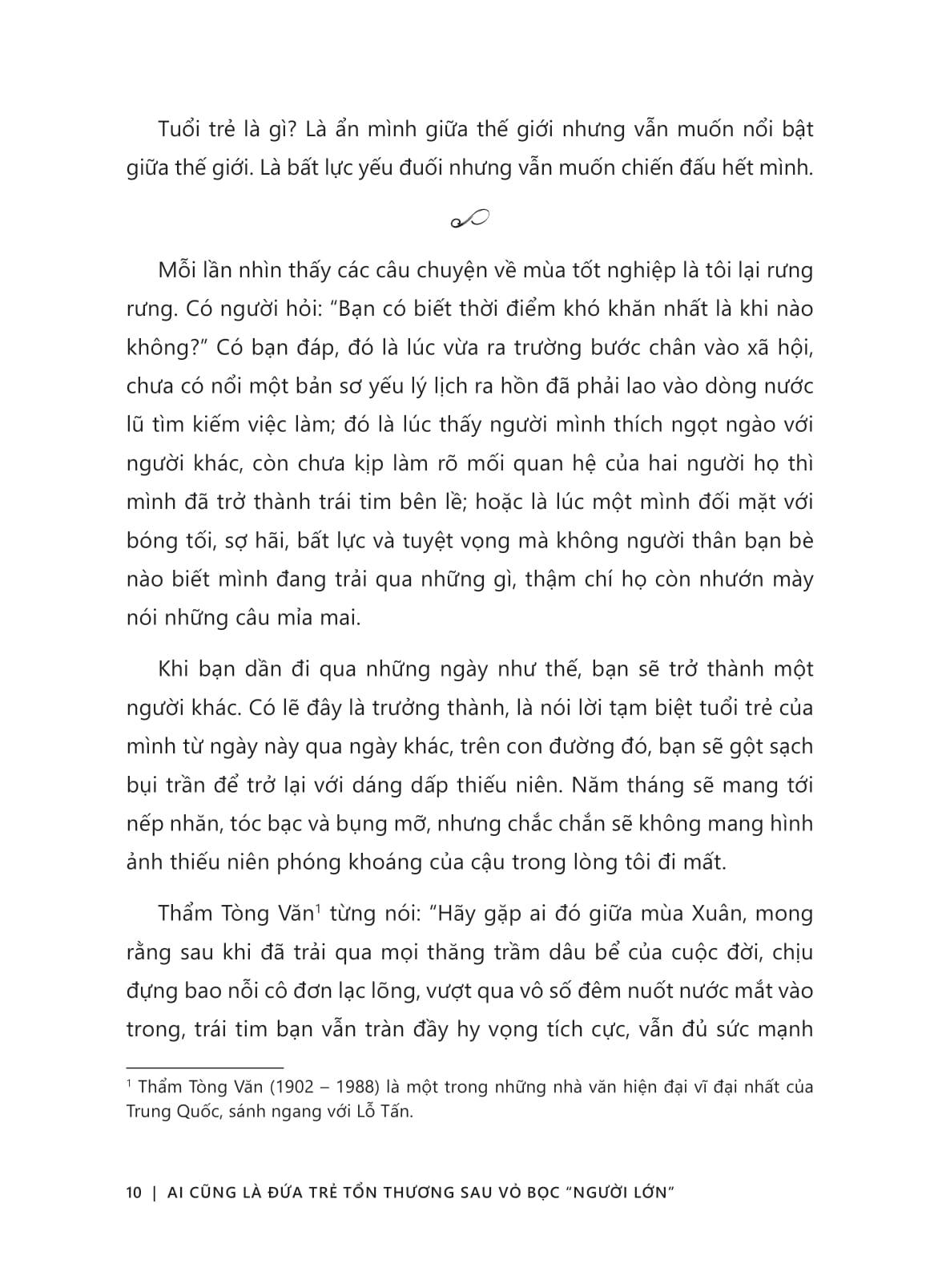 Cuốn sách tổng hợp những câu chuyện của người trưởng thành và cảm xúc của tuổi trẻ từ các khía cạnh tình cảm gia đình, tình yêu, học tập, thái độ sống, hình thành tính cách,... để người đọc có cảm giác như chính m.ình đang nhìn lại chặng đường đã đi và quyết tâm tiến về phía trước.