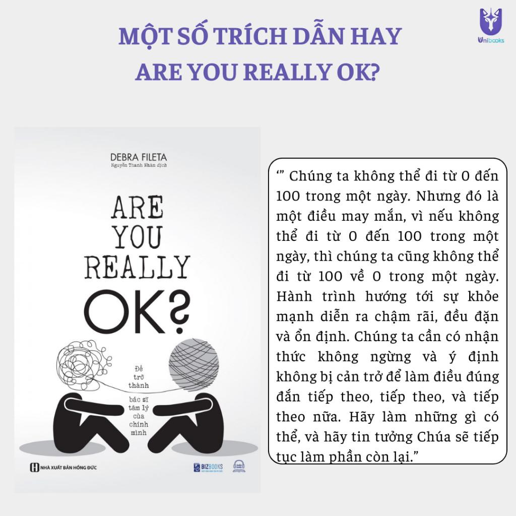 Thông qua những bài tập tự phản chiếu, các câu chuyện thực tế và lời khuyên giàu tính ứng dụng, Are you really OK? giúp bạn từng bước trở thành bác sĩ tâm lý của chính mình. Cuốn sách nhấn mạnh tầm quan trọng của việc duy trì nhận thức và hành động đúng đắn, từng bước một. Hãy bắt đầu bằng những điều nhỏ bé bạn có thể làm hôm nay và tin rằng những điều kỳ diệu sẽ xảy ra khi bạn kiên trì.