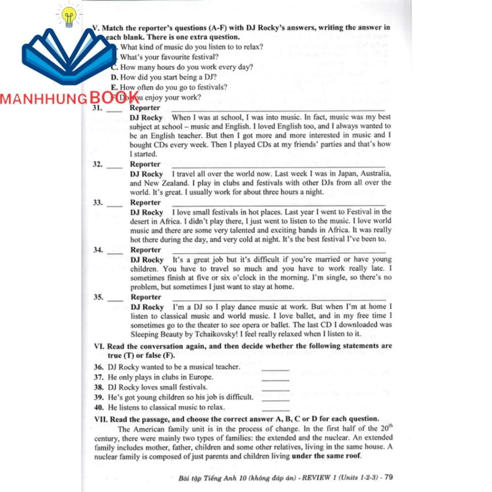 Bài Tập Tiếng Anh 10 - Không Đáp Án (Biên Soạn Theo Chương Trình GDPT Mới) gồm 10 đơn vị bài học: Family Life, Humans and the Environment, Music, For A Better Community, Inventions, Gender Equality, Viet Nam and International Organisations, New Ways to Learn, Protecting the Environment, Ecotourism, và 4 bài ôn tập Review.