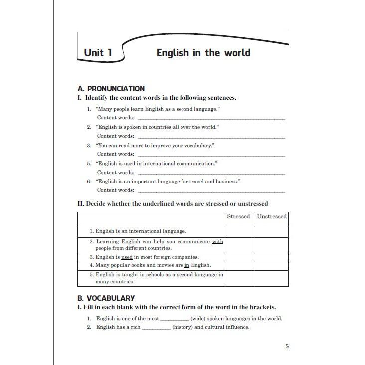 Các bài tập trong mỗi đơn vị bài học được bố cục theo từng phần rõ ràng như sau: