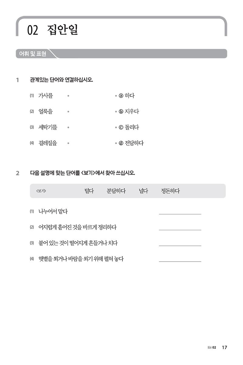● Phần 1: Luyện tập từ vựng, giúp người học ôn tập và luyện tập từ vựng, ứng dụng vào các câu, tình huống cụ thể. Các từ vựng được đưa ra trên cơ sở phù hợp với nội dung và chủ đề được học trong giáo trình Tiếng Hàn tổng hợp trung cấp 4.