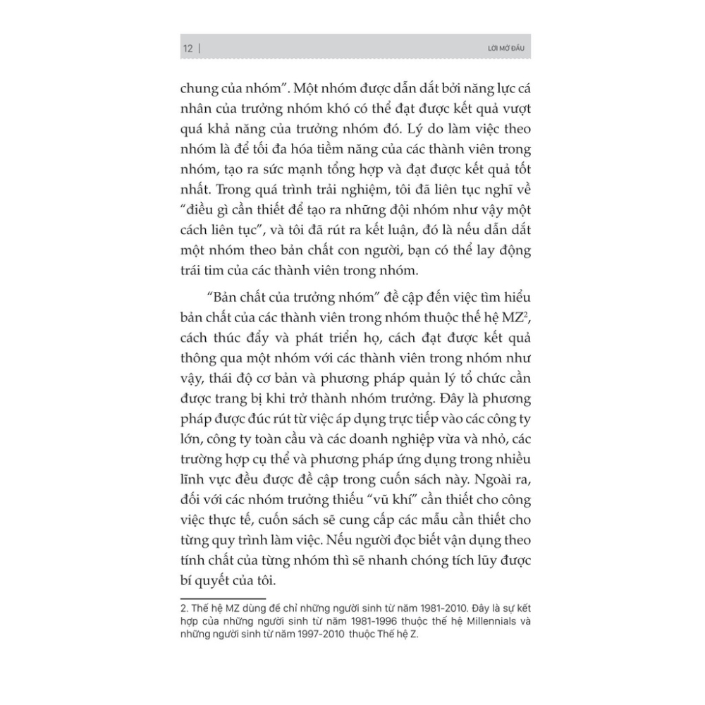 Cuốn sách mang tới những kiến thức để những trưởng nhóm thúc đẩy và phát triển các thành viên trong nhóm, xây dựng thái độ và phương pháp quản lý tổ chức cần được trang bị khi trở thành trưởng nhóm. Ngoài ra, cuốn sách còn cung cấp những mẫu cần thiết cho từng quy trình làm việc. Các phương pháp này được tác giả rút ra từ kinh nghiệm thực tiễn khi áp dụng tại đa dạng các mô hình công ty, từ các công ty lớn, đến các công ty toàn cầu, các doanh nghiệp vừa và nhỏ. Chỉ cần vận dụng những phương pháp này, những khó khăn khi làm trưởng nhóm không còn là nỗi lo.