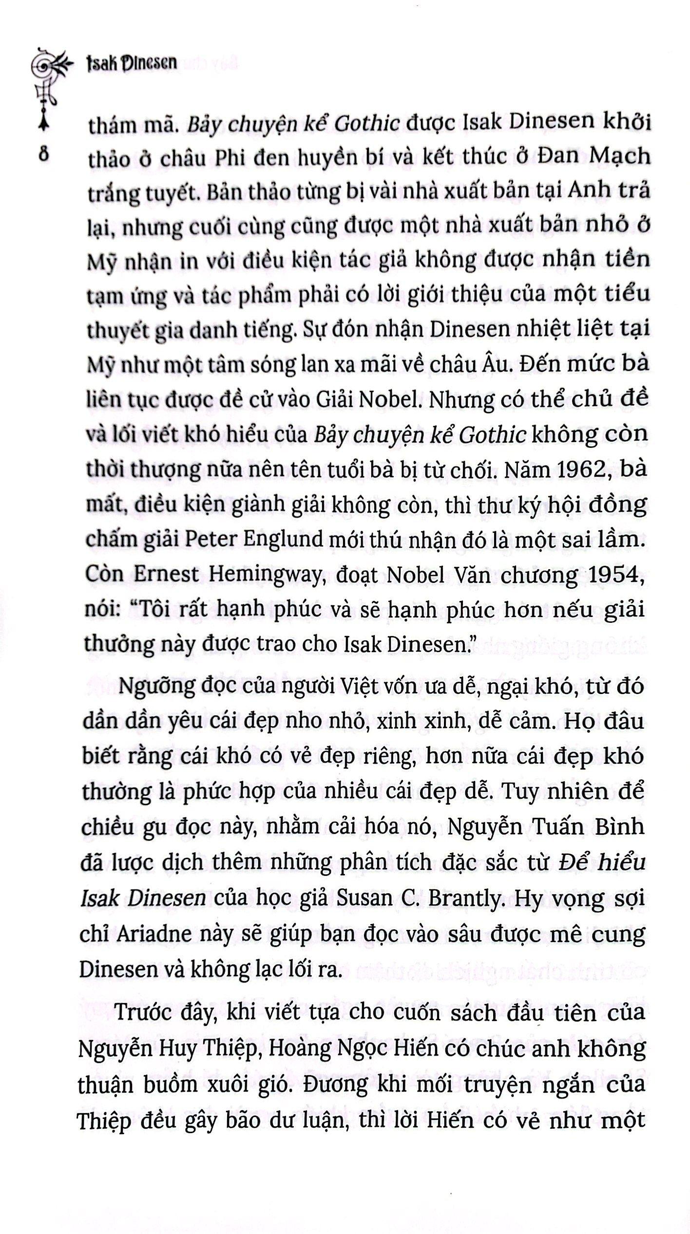 Khi nhắc tới nhà văn Đan Mạch Isak Dinesen, chắc hẳn bạn đọc Việt Nam sẽ nghĩ ngay tới “Châu Phi nghìn trùng” nổi tiếng – cuốn hồi ký của bà về 17 năm sống ở châu Phi – qua bản dịch ngọt ngào của dịch giả Hà Thế Giang. Nhưng có lẽ ít bạn đọc biết rằng chính tác phẩm đầu tay “Bảy chuyện kể Gothic” xuất bản năm 1934 ở Mỹ đã đưa Isak Dinesen trở thành một trong những nhà văn quan trọng nhất thế kỷ XX.