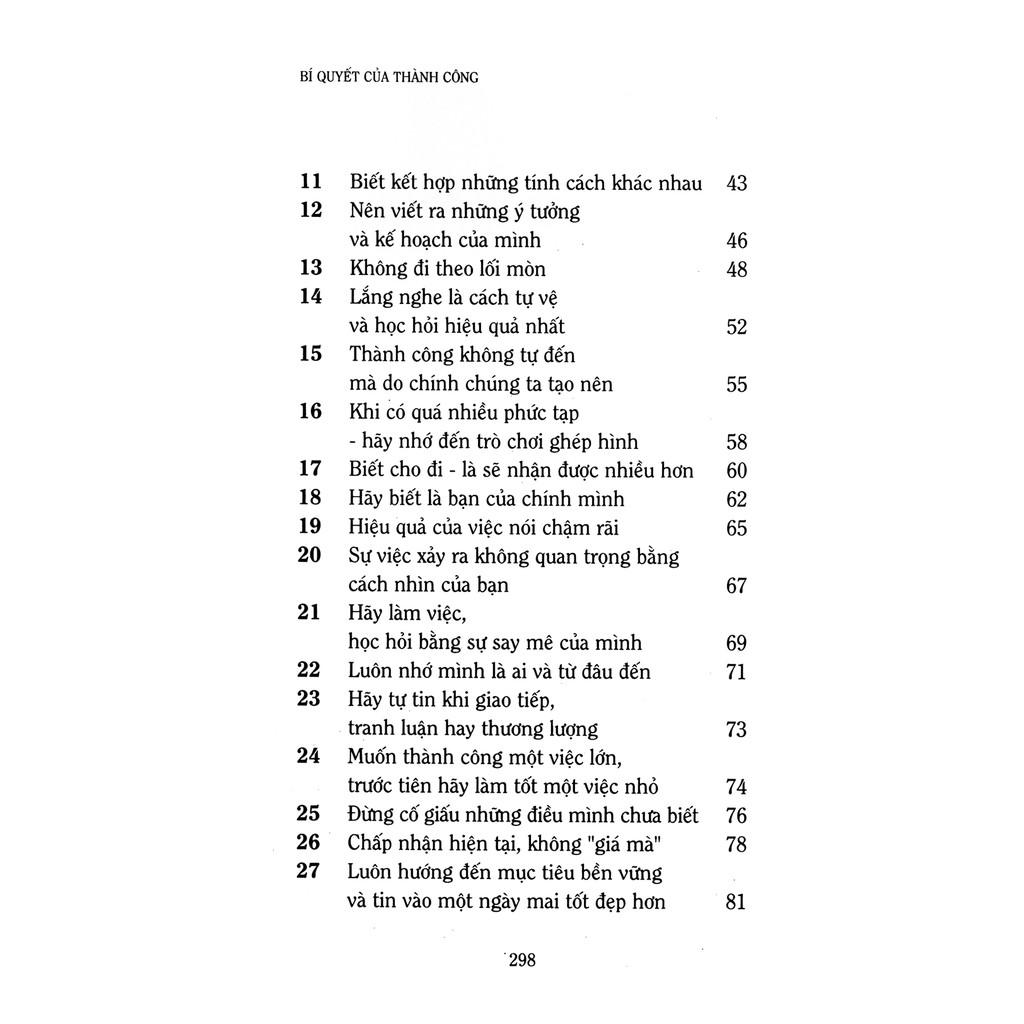 Bí quyết của thành công không phải là những gì xa lạ và khó thực hiện, đòi hỏi phải rèn luyện công phu trong nhiều năm trời mới có được. Cuốn sách không đưa ra những điều cao siêu hay đặt ra những mục tiêu lớn lao vượt khỏi khả năng của mỗi người. Mà chỉ đơn giản là những thái độ sống, những suy nghĩ tích cực, những điều khuyên thực tế mà bạn có thể áp dụng ngay vào lúc này – bất kể hoàn cảnh và tình trạng hiện có của bạn.