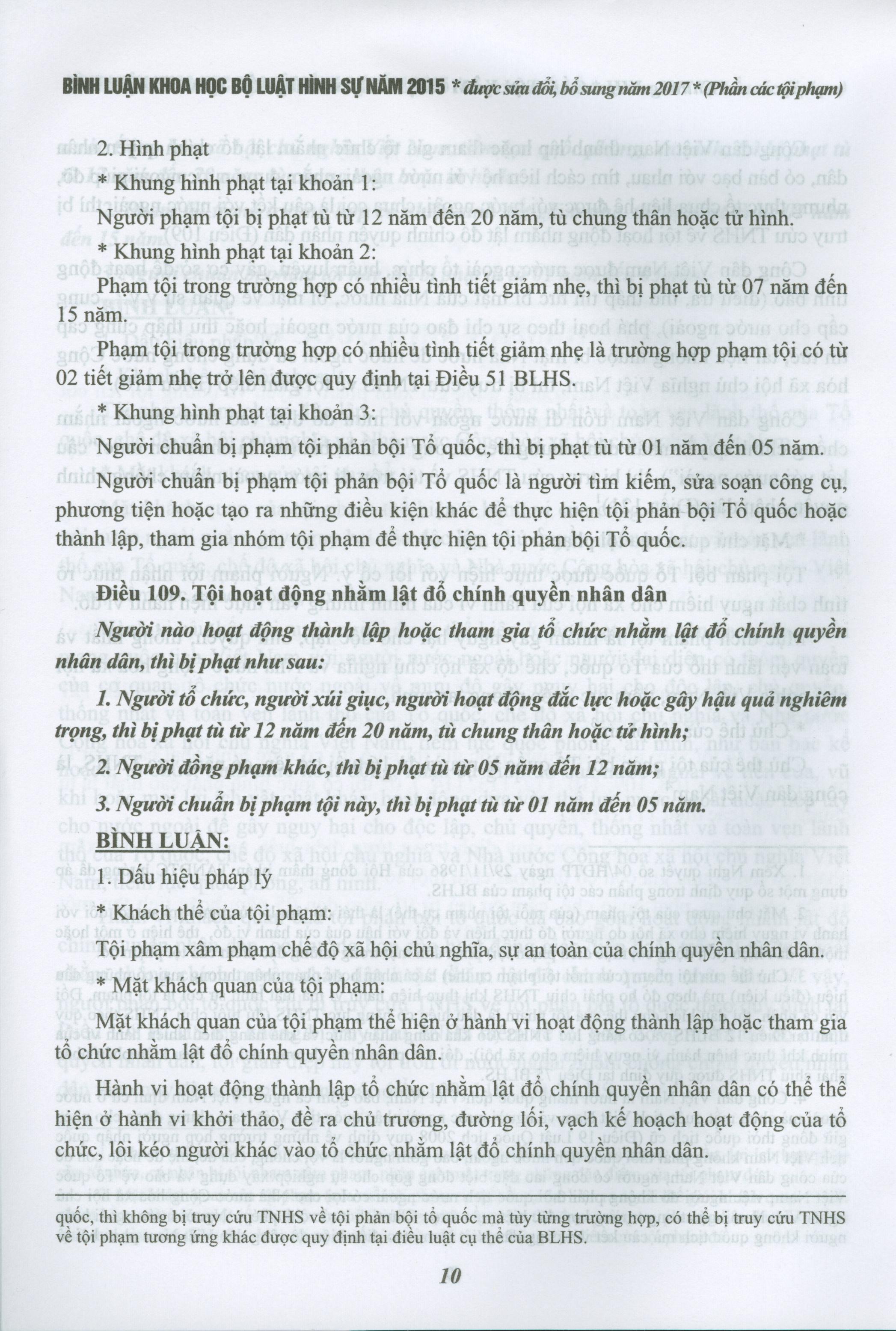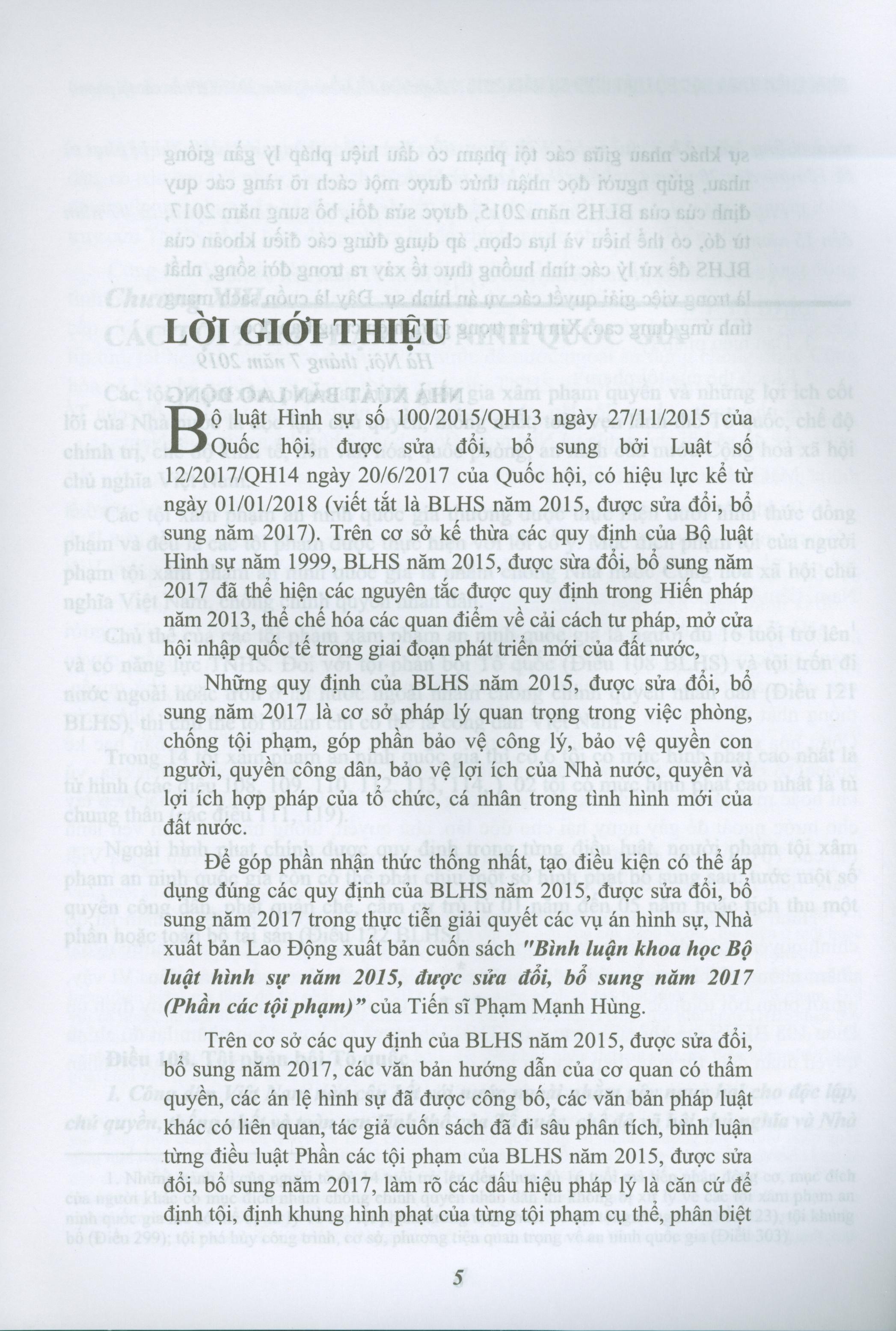 Trên cơ sở các quy định của BLHS năm 2015, được sửa đổi, bổ sung năm 2017, các văn bản hướng dẫn của cơ quan có thẩm quyền, các án lệ hình sự đã được công bố, các văn bản pháp luật khác có liên quan, tác giả cuốn sách đã đi sâu phân tích, bình luận từng điều luật Phần các tội phạm của BLHS năm 2015, được sửa đổi, bổ sung năm 2017, làm rõ các dấu hiệu pháp lý là căn cứ để định tội, định khung hình phạt của từng tội phạm cụ thể
