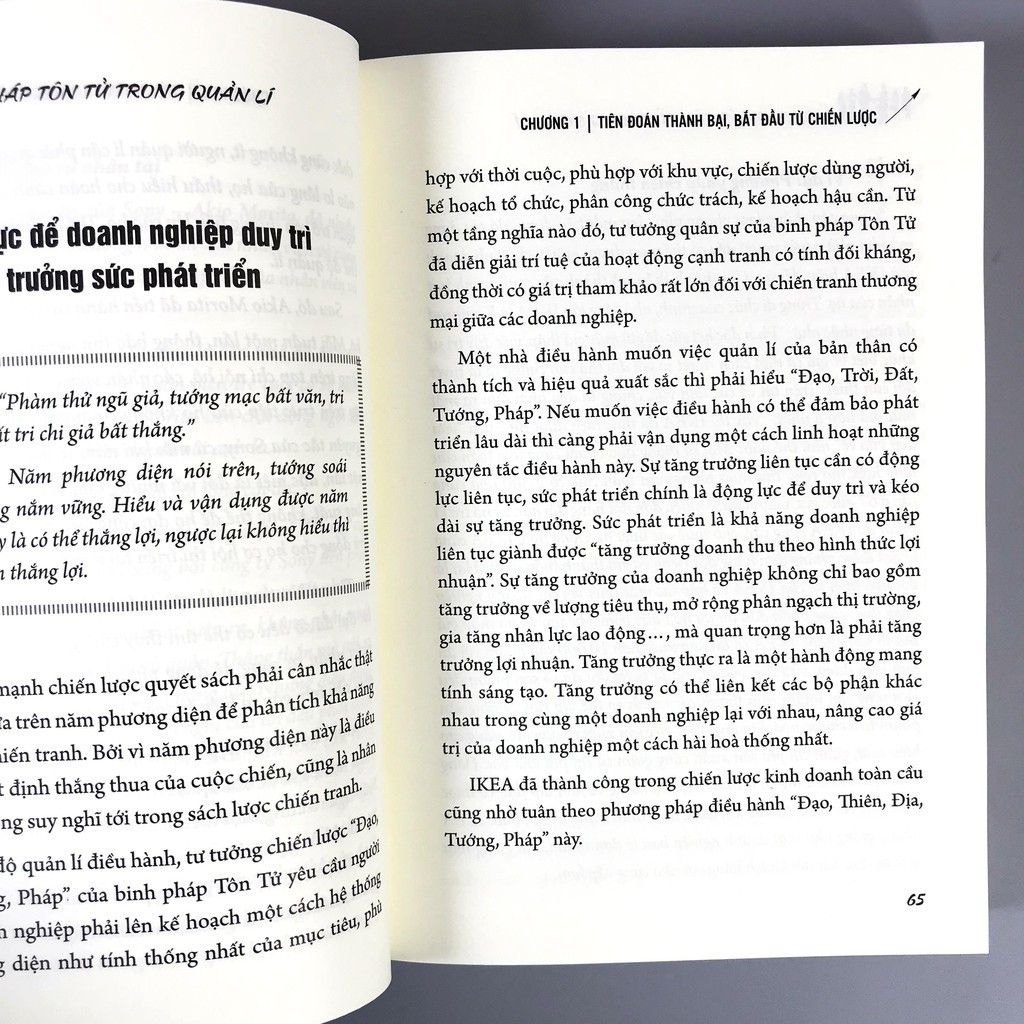 Binh Pháp Tôn Tử Trong Quản Lý Binh pháp Tôn Tử là bộ sách lược về chiến thuật trinh chiến do Tôn Tử biên soạn từ thời Xuân Thu. Đây là một trong những bộ sách hàng đầu khi bàn đến kế hoạch chiến lược và những binh pháp được nhắc đến trong bộ sách cũng được áp dụng linh hoạt trong nhiều lĩnh vực khác nhau. Cuốn sách “Binh Pháp Tôn Tử Trong Quản Lý” sẽ sử dụng các “chiêu thức” này vào công việc quản lý, điều hành doanh nghiệp, giúp xác định phương hướng pháp triển và cách thức đạt được thành công. Tại sao nhà quản lí phải học hỏi Binh pháp Tôn Tử? Trong thời đại kinh doanh ngày nay, cạnh tranh đã không còn đơn thuần là cạnh tranh về vốn, cạnh tranh về tri thức, mà đã nâng lên thành cạnh tranh về trí tuệ tư duy của tầng lớp lãnh đạo các doanh nghiệp. Cho dù là người phương Đông hay phương Tây, chúng ta đều cần có trí tuệ ở tầm sâu hơn và ý thức tư duy ở tầm cao hơn. Binh pháp Tôn Tử là đại diện tiêu biểu của văn hoá Hoa Hạ, chứa đựng vô số trí tuệ triết học phương Đông. Cho đến ngày nay, chúng ta vẫn kinh ngạc và thán phục trước tư tưởng biện chứng trong Binh pháp Tôn Tử, và sự sâu xa rộng lớn của tư duy thái cực của nó. Những gì chúng ta học hỏi được từ Binh pháp Tôn Tử không chỉ là tri thức, mà còn nắm bắt được tinh tuý của phương thức tư duy phương Đông chứa đựng trong đó. Binh pháp Tôn Tử bao trùm vũ trụ, cấu thành mọi hiện tượng trong kinh doanh, dựa vào văn hoá phương Đông để làm sáng tỏ và phát triển một cách toàn diện rất nhiều lí luận kinh doanh của phương Tây hiện đại như quản lí, chiến lược, huy động vốn, hợp tác liên minh, marketing thị trường… Thông qua so sánh tư duy phương Đông và lí luận kinh doanh phương Tây, cuốn sách tiến hành cuộc giao thoa chưa từng có về mặt tư duy; và cuộc so sánh, giao thoa của nền văn hoá Đông Tây này sẽ kích thích tư duy kinh doanh và mô hình sáng tạo của chúng ta từ nhiều góc độ, từ đó càng học hỏi được nhiều hơn, sâu sắc hơn nữa những đạo lí về quản lí trong thời đại kinh doanh mới. Trong cuốn sách Cha giàu, cha nghèo có viết: “Sự giàu có thực sự là một kiểu phương thức tư duy, chứ không phải là gửi bao nhiêu tiền trong ngân hàng”. Tương tự như vậy, điều quan trọng nhất ta học được trong Binh pháp Tôn Tử chính là học tập phương pháp tư duy của cuốn sách, chứ không chỉ dừng lại ở việc hiểu được ý tứ của câu chữ. Sau khi nắm vững tư duy chiến lược, tư duy biện chứng và nguyên tắc cơ bản của nó, dung hoà và thấu hiểu 13 chương, tổng hợp phân tích và lí giải một cách sâu sắc quan điểm tư tưởng trong sách, hấp thu tinh hoa, nắm bắt phong thái của cuốn sách, từ đó chúng ta sẽ tìm ra những gợi ý hữu ích cho việc thúc đẩy thị trường, cạnh tranh giành thắng lợi của mình. Trong quá trình học tập, nghiên cứu Binh pháp