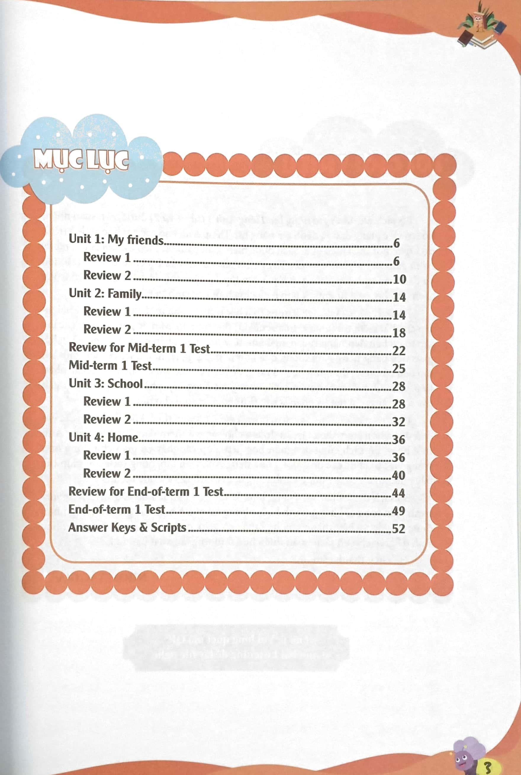 Bộ sách gồm 24 đề, với 8 units (bài học) chính. Sau mỗi 2 units sẽ có 1 bài ôn tập cho bài kiểm tra (giữa kì hoặc cuối kì) theo sau đó. Mỗi đề gồm đầy đủ các bài tập từ cơ bản đến nâng cao về ngữ âm, từ vựng, ngữ pháp để phát triển năng lực giao tiếp bằng tiếng Anh thông qua bốn kĩ năng nghe, nói, đọc, và viết. Mỗi bài tập đều có câu ví dụ minh họa rõ ràng, dễ hiểu để các em có thể tự làm các phần tiếp theo. Ở cuối mỗi quyển sách, chúng tôi cung cấp phần đáp án với lời giải thích rõ ràng, chi tiết và phần script (lời thoại) cụ thể cho mỗi bài nghe.