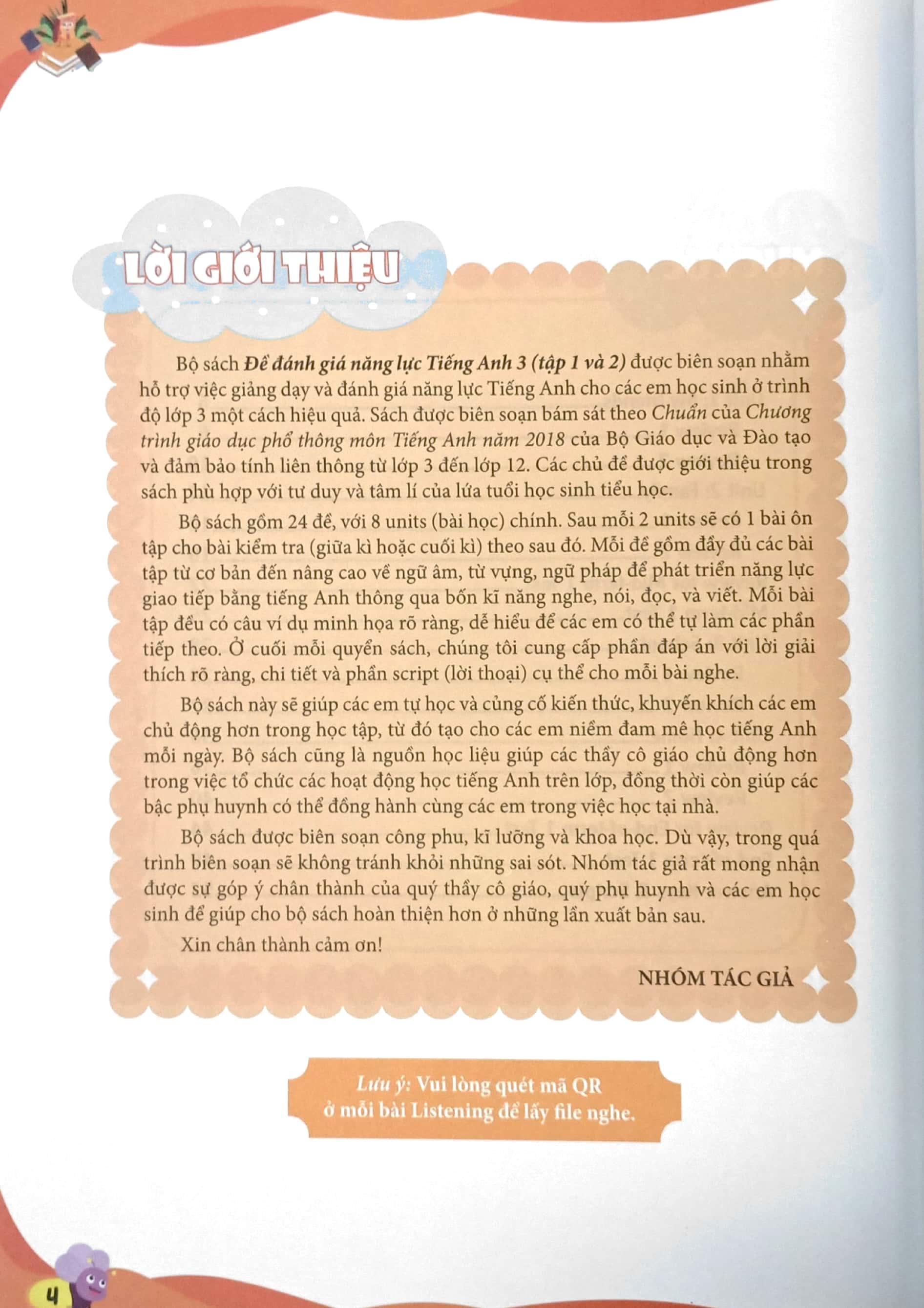 Bộ sách Để đánh giá năng lực Tiếng Anh 3 (tập 1 và 2) được biên soạn nhằm hỗ trợ việc giảng dạy và đánh giá năng lực Tiếng Anh cho các em học sinh ở trình độ lớp 3 một cách hiệu quả. Sách được biên soạn bám sát theo Chuẩn của Chương trình giáo dục phổ thông môn Tiếng Anh năm 2018 của Bộ Giáo dục và Đào tạo và đảm bảo tính liên thông từ lớp 3 đến lớp 12. Các chủ đề được giới thiệu trong sách phù hợp với tư duy và tâm lí của lứa tuổi học sinh tiểu học.