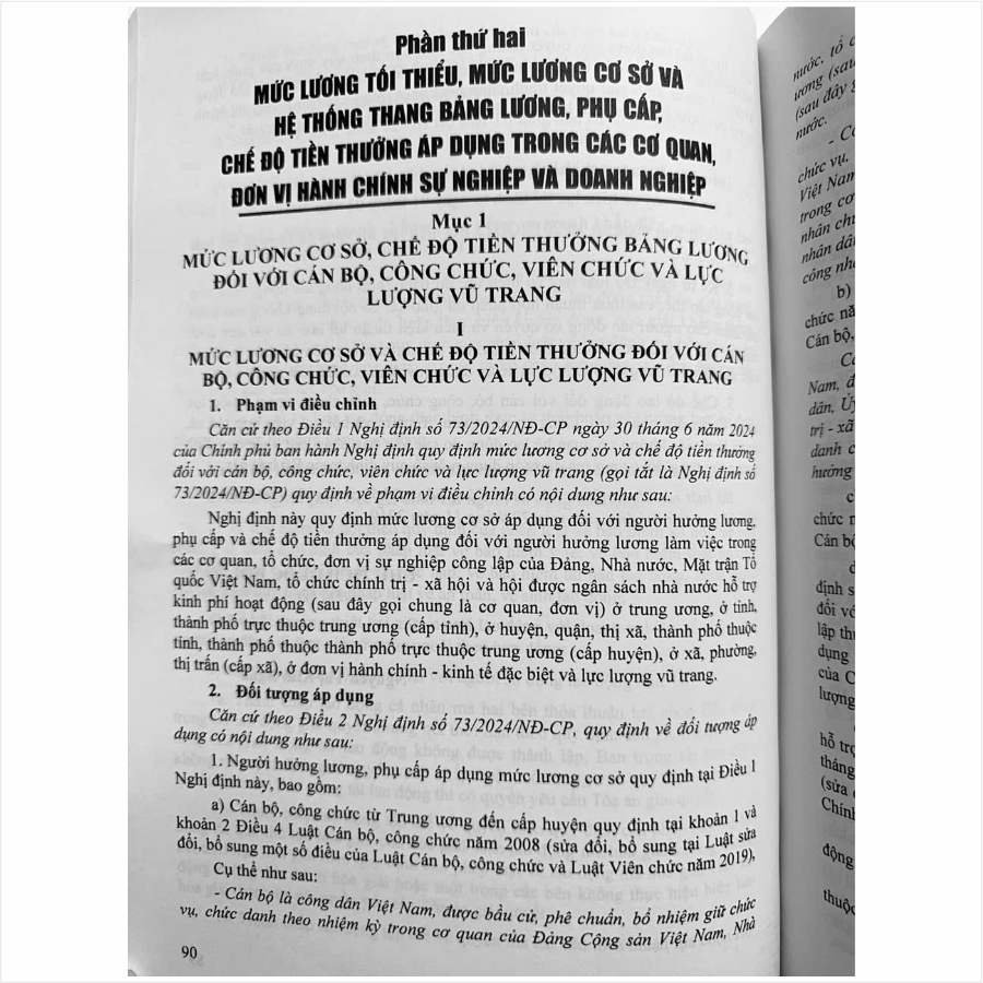 Ngày 30 tháng 06 năm 2024, Chính phủ ban hành Nghị định số 73/2024/NĐ-CP của Chính phủ quy định mức lương cơ sở và chế độ tiền thưởng đối với cán bộ, công chức, viên chức và lực lượng vũ trang và Nghị định số 74/2024/NĐ-CP của Chính phủ quy định mức lương tối thiểu đối với người lao động làm việc theo hợp đồng lao động. Nghị định số 75/2024/NĐ-CP của Chính phủ điều chỉnh lương hưu, trợ cấp bảo hiểm xã hội và trợ cấp hằng tháng. Thực hiện mức lương tối thiểu và chế độ tiền lương, tiền thưởng gắn với trách nhiệm người đứng đầu cơ quan, đơn vị trong việc đánh giá, xếp loại mức độ hoàn thành công việc của người hưởng lương, kịp thời động viên, khích lệ, tạo động lực cho cán bộ, công chức, viên chức và lực lượng vũ trang nâng cao chất lượng, hiệu quả công tác, góp phần nâng cao hiệu lực, hiệu quả hoạt động của hệ thống chính trị và bảo vệ người lao động.