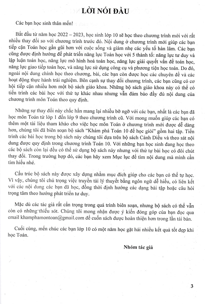 Bắt đầu từ năm học 2022 - 2023, học sinh lớp 10 sẽ học theo chương trình mới với rất nhiều thay đổi so với chương trình trước đó. Nội dung ở chương trình mới giúp các bạn tiếp cận Toán học gần gũi hơn với cuộc sống và giảm nhẹ các yếu tố hàn lâm. Các bạn cũng được định hướng để phát triển năng lực Toán học với 5 thành tố: năng lực tư duy và lập luận toán học, năng lực mô hình hóa toán học, năng lực giải quyết vấn đề toán học, năng lực giao tiếp toán học, và năng lực sử dụng công cụ và phương tiện học toán. Do đó, ngoài nội dung chính học theo chương, bài, các bạn còn được học các chuyên đề và các hoạt động thực hành trải nghiệm. Bên cạnh sự thay đổi chương trình, các bạn cũng có cơ hội tiếp cận nhiều hơn một bộ sách giáo khoa. Những bộ sách giáo khoa này có thể có tiến trình các bài học với thứ tự khác nhau nhưng vẫn đảm bảo đầy đủ nội dung của chương trình môn Toán theo quy định.