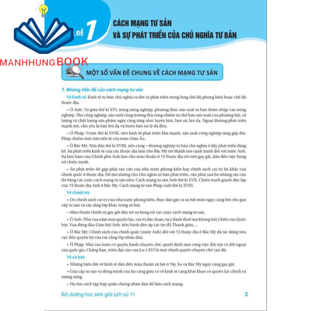 - Cung cấp kiến thức cơ bản, cô đọng nhất theo từng chủ đề, giúp các em nắm vững những nội dung lịch sử một cách khái quát, sát hợp với từng bài lịch sử cụ thể. Trong đó có cả phần kiến thức nâng cao để giúp các em hiểu sâu sắc các vấn đề lịch sử nhằm tham gia thi học sinh giỏi các cấp. – Cuối mỗi chủ đề, tác giả nêu những câu hỏi ôn tập giúp các em vận dụng những kiến thức đã học để trả lời các câu hỏi tương đối khó, tương ứng với các đề thi học sinh giỏi môn Lịch sử lớp 11.
