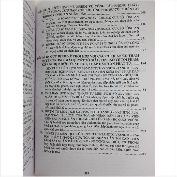 - Thông tư số 06/2022/TT-BCA ngày 17/01/2022 Quy định quy trình thực hiện nhiệm vụ công tác phòng cháy, chữa cháy, cứu nạn, cứu hộ trong Công an nhân dân; - Nghị định 144/2021/NĐ-CP ngày 31/12/2021 Quy định xử phạt vi phạm hành chính trong lĩnh vực an ninh, trật tự, an toàn xã hội; phòng, chống tệ nạn xã hội; phòng cháy, chữa cháy; cứu nạn, cứu hộ; phòng, chống bạo lực gia đình… Nhằm phổ biến đến Quý Cơ quan, Đơn vị và Quý khách hàng thân thiết nắm bắt kịp thời những quy định mới nêu trên. Nhà sách Nam Việt xin trân trọng giới thiệu cuốn sách: Sách CẨM NANG PHÁP LUẬT DÀNH CHO NGÀNH CÔNG AN NHÂN DÂN Nội dung sách gồm 8 phần: Phần thứ nhất. Tìm hiểu LUẬT CÔNG AN NHÂN DÂN VÀ CÁC VĂN BẢN HƯỚNG DẪN THI HÀNH Phần thứ hai. QUY ĐỊNH MỚI VỀ THANH TRA, GIẢI QUYẾT KHIẾU NẠI, TỐ CÁO VÀ TIẾP CÔNG DÂN TRONG CÔNG AN NHÂN DÂN Phần thứ ba. QUY ĐỊNH VỀ NHIỆM VỤ CÔNG TÁC PHÒNG CHÁY, CHỮA CHÁY, CỨU NẠN, CỨU HỘ, ỨNG PHÓ SỰ CỐ, THIÊN TAI TRONG CÔNG AN NHÂN DÂN Phần thứ tư. QUY ĐỊNH VỀ PHỐI HỢP VỚI CÁC CƠ QUAN CÓ THẨM QUYỀN TRONG GIẢI QUYẾT TỐ GIÁC, TIN BÁO VỀ TỘI PHẠM, KIẾN NGHỊ KHỞI TỐ, XÉT XỬ, CHẤP HÀNH ÁN PHẠT TÙ Phần thứ năm. QUY ĐỊNH ĐIỀU CHỈNH MỨC TRỢ CẤP HẰNG THÁNG ĐỐI VỚI CÁN BỘ CÔNG AN Phần thứ sáu. Tìm hiểu LUẬT CƯ TRÚ VÀ MỘT SỐ BIỆN PHÁP THI HÀNH LUẬT CƯ TRÚ Phần thứ bảy. Tìm hiểu LUẬT CẢNH SÁT CƠ ĐỘNG Phần thứ tám. QUY ĐỊNH MỚI VỀ XỬ PHẠT VI PHẠM HÀNH CHÍNH TRONG LĨNH VỰC AN NINH, TRẬT TỰ, AN TOÀN XÃ HỘI; PHÒNG, CHỐNG TỆ NẠN XÃ HỘI; PHÒNG CHÁY, CHỮA CHÁY; CỨU NẠN, CỨU HỘ; PHÒNG, CHỐNG BẠO LỰC GIA ĐÌNH Cảm ơn các bạn đã ghé thăm shop Nhà sách Nam Việt ! CẨM NANG PHÁP LUẬT DÀNH CHO NGÀNH CÔNG AN NHÂN DÂN CẨM NANG PHÁP LUẬT DÀNH CHO NGÀNH CÔNG AN NHÂN DÂN