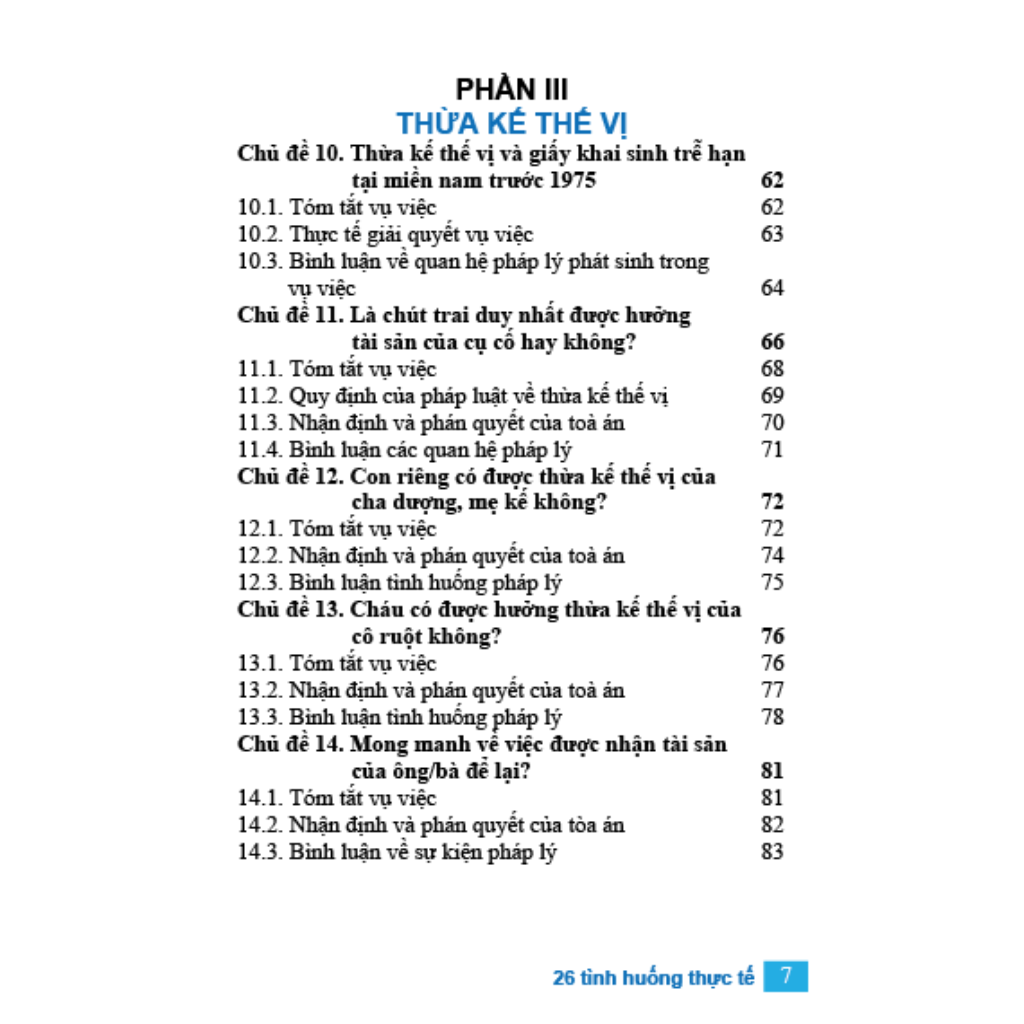 - Cẩm nang về thừa kế và 26 tình huống thực tế là cuốn sách được xây dựng dựa trên các tình huống pháp lý có thật, từ các bản án có hiệu lực của Toà án và được phân tích, bình luận, kết luận với văn phong đơn giản nhất nhằm đáp ứng độc giả không phải là các chuyên gia pháp lý.