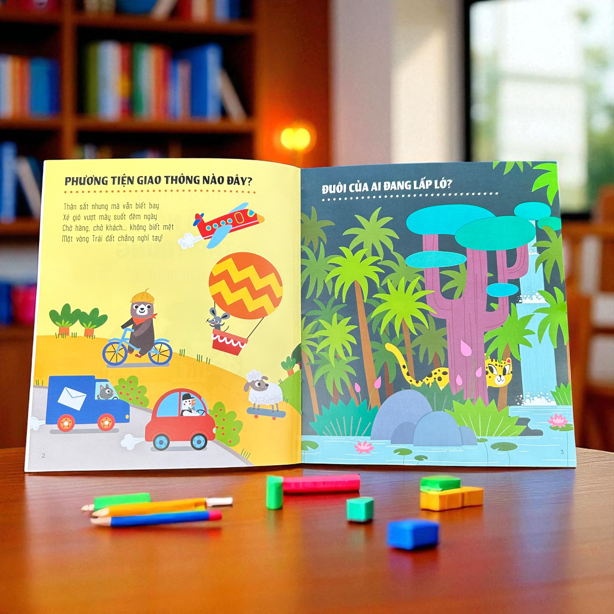 Trẻ sẽ tìm các đồ vật, con vật hoặc chi tiết nhỏ được giấu khéo léo trong tranh. Với các bối cảnh phong phú như phòng ngủ, khu vườn, đáy đại dương, thế giới kẹo ngọt… bé sẽ được rèn kỹ năng quan sát, tập trung cao độ và học cách không bỏ cuộc khi gặp thử thách