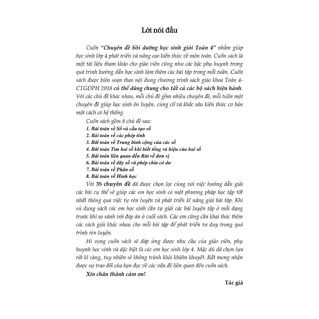 THÔNG TIN CHI TIẾT - Tác giả : Phạm Đức Huy - Nhà xuất bản : NXB Dân Trí - Kích thước : 16 x 24 cm - Số trang : 222 trang - Loại bìa : Bìa Mềm - Công ty phát hành : sách minh thắng - Năm xuất bản : 2023 GIỚI THIỆU SÁCH DÙNG CHUNG CHO TẤT CẢ BỘ SÁCH HIỆN HÀNH Với các chủ đề khác nhau, mỗi chủ đề gồm nhiều chuyên đề, mỗi tuần một chuyên đề giúp học sinh ôn luyện, củng cố và khắc sâu kiến thức cơ bản một cách có hệ thống. Cuốn sách gồm 8 chủ đề sau: 1. Bài toán về số và cấu tạo số 2. Bài toán về các phép tính 3. Bài toán về trung bình cộng của các số 4. Bài toán tìm hai số khi biết tổng và hiệu của hai số 5. Bài toán liên quan đến Rút về đơn vị 6. Bài toán về dãy số và phép chia có dư 7. Bài toán về phân số 8. Bài toán về hình học Với 35 chuyên đề đã được chọn lọc cùng với việc hướng dẫn giải các bài cụ thể sẽ giúp các em học sinh có một phương pháp học tập tốt nhất thông qua việc tự rèn luyện và phát triển kĩ năng giải bài tập.