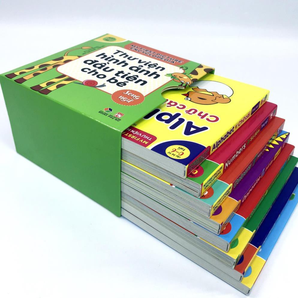 - Bộ Hộp Thư Viện Hình Ảnh Đầu Tiên Cho Bé Từ 0 - 6 Tuổi Song Ngữ Việt Anh Bộ sách gồm 8 quyển song ngữ, sách được thiết kế hình ảnh vẽ sắc nét , giúp bé nhận biết hình ảnh dễ dàng hơn , cuốn sách được thiết kế gọn nhỏ , các trang được làm chất liệu bìa cứng giúp bé cầm sách dễ dàng mà không lo bị hỏng sách , bé vừa học vừa chơi nhanh hơn , Bộ sách gồm các cuốn sau