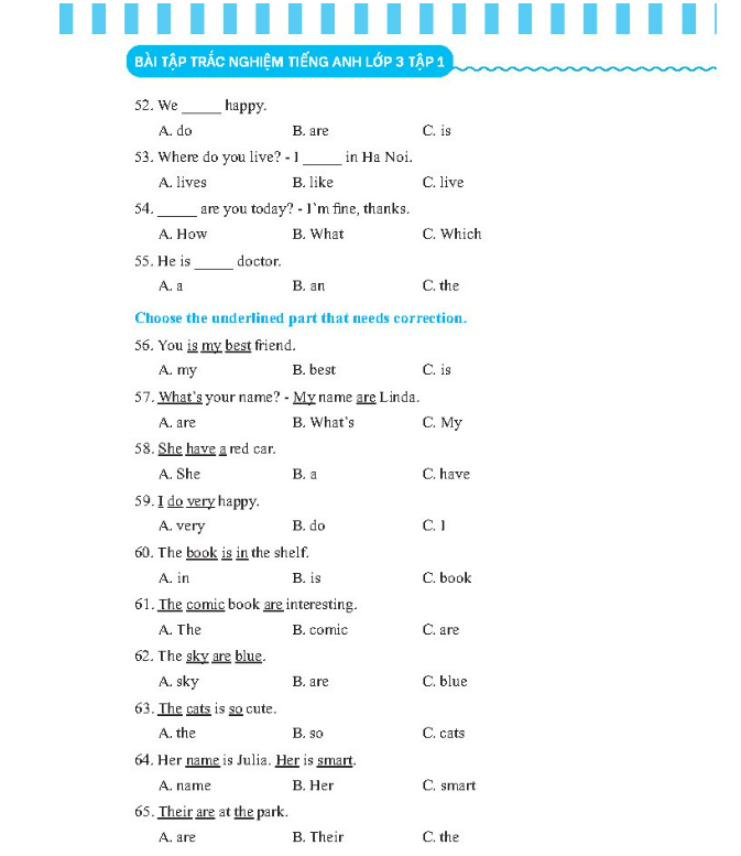 ======GIỚI THIỆU SÁCH=======   Tiếng Anh ngày càng quan trọng trong xã hội hiện nay. Môn học này được coi là một trong những môn học quan trọng trong nhà trường. Việc học và hoàn thiện các kỹ năng tiếng Anh cũng như việc làm bài đạt điểm cao trong các bài kiểm tra, bài thi trong trường luôn là vấn đề mà học sinh, giáo viên và phụ huynh quan tâm.   Cuốn sách được biên soạn với sự chung tay của các giáo viên giàu kinh nghiệm từ các trường dựa trên nội dung bám sát sách giáo khoa Tiếng Anh 3 nhằm mục đích hỗ trợ và khuyến khích quá trình tự học, tự ôn luyện của học sinh.   Cuốn sách bao gồm 10 đơn vị bài học từ unit 1 - unit 10 theo chương trình sách giáo khoa và được chia 2 bài Test, mỗi bài Test có các bài tập trắc nghiệm giúp học sinh luyện về ngữ âm, từ vựng, ngữ pháp và các kỹ năng trong tiếng Anh từ cơ bản đến nâng cao.   Củng cố kiến thức cho các bài kiểm tra định kì