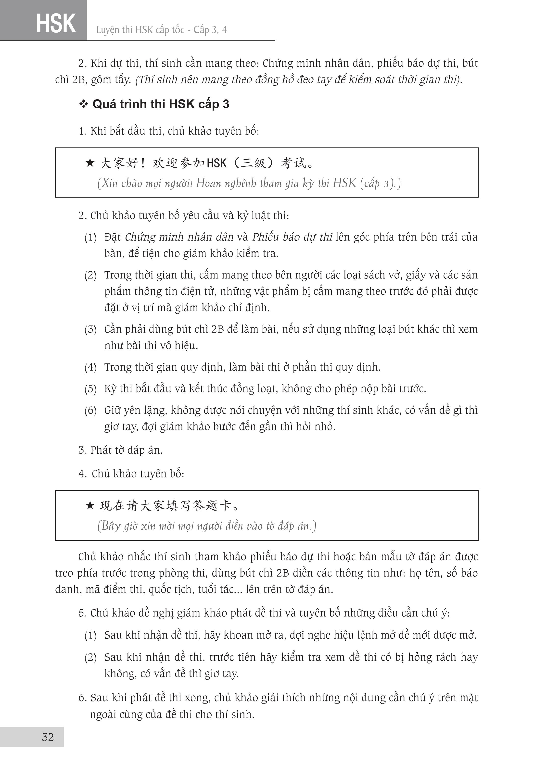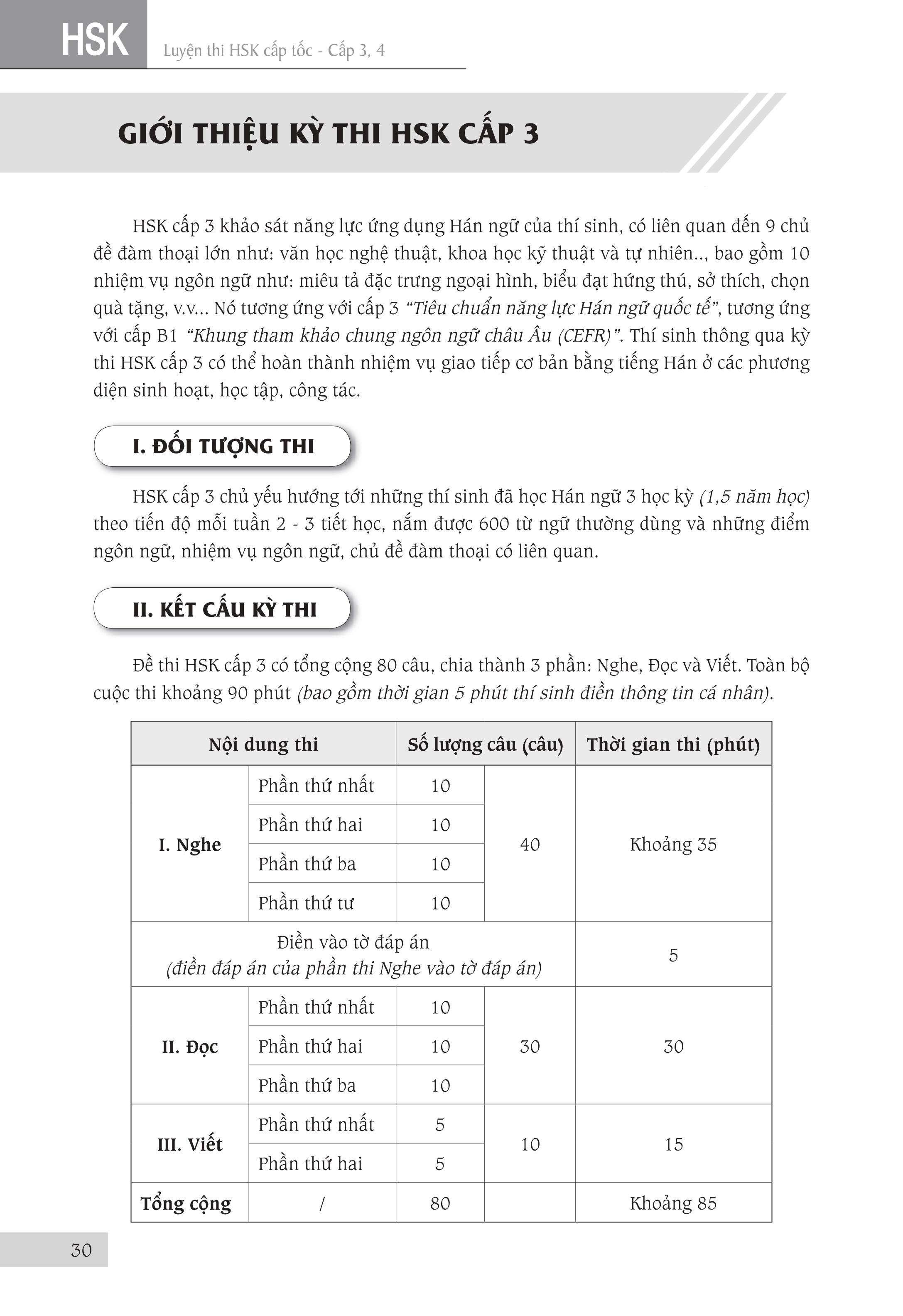 Luyện thi HSK cấp tốc cấp 3+4 Tác giả: Trương Văn GIới & Lê Khắc Kiều Lục Nhà xuất bản Đại Học Quốc Gia TPHCM Số trang: 424 Kích thước: 18.5cm x 26.5cm x 2cm Cân nặng: 570g Năm xuất bản: 2018 Đầu tiên xin được thuyết minh về chữ “cấp tốc” mà chúng tôi dùng trong tên của bộ sách. “Cấp tốc” không phải theo ý nghĩa đơn giản là nhanh và dễ dàng, không cần phải học nhiều mà cũng có thể thi đậu. Ý nghĩa của từ “Cấp tốc” mà chúng tôi hướng đến khi biên soạn bộ sách này là giúp người học nắm vững toàn bộ kiến thức của kỳ thi của một cách nhanh nhất mà vẫn bảo đảm kết quả tốt nhất. Người học vẫn phải làm việc cật lực để chuẩn bị tốt cho kỳ thi mới hy vọng có được kết quả khả quan. Kỳ thi HSK do Văn phòng Hán ngữ nhà nước Trung Quốc (gọi tắt là HANBAN) tổ chức. HANBAN đã xây dựng chuẩn kiến thức (từ vựng, điểm ngôn ngữ, chủ đề đàm thoại …) cho từng cấp độ, từ đó đưa ra đề thi mẫu tương ứng cho cấp độ thi đó. Như vậy, Đề cương và Đề thi mẫu của HANBAN chính là tài liệu chuẩn để thí sinh ôn luyện, giáo viên và các trường giảng dạy cho kỳ thi HSK. Nó cũng là đề cương để các tác giả, nhà xuất bản và các đơn vị biên soạn và xuất bản các tài liệu cho kỳ thi này. Để đạt mục tiêu “cấp tốc” đã giải thích ở trên, chúng tôi dựa vào Đề cương và Đề thi mẫu của HANBAN, cũng như những tài liệu luyện thi HSK của Trung Quốc để biên soạn bộ sách này. Từng phần của bài thi được giới thiệu qua một cấu trúc thống nhất như sau: I. Đặc điểm dạng đề: Phần này giới thiệu cấu trúc, đặc điểm và cách làm dạng bài thi này. Ở đề thi viết còn giới thiệu cách chấm điểm của dạng đề. Rõ ràng là để làm bài thi tốt, đầu tiên là phải nắm vững đề thi và biết cách làm loại đề thi đó. II. Những lỗi thường gặp: Chúng tôi tổng hợp những lỗi thường gặp của thí sinh khi làm dạng đề thi này. Học tập từ sai lầm là cách cực kỳ hiệu quả để tránh lặp lại những sai lầm của những người đi trước đã gặp phải khi làm bài. III. Trọng điểm thi, cách thức và kỹ xảo làm bài: Đây là phần quan trọng nhất của tài liệu Phần trọng điểm thi giới thiệu những trọng tâm mà dạng đề thi tập trung vào. Liên quan đến trọng điểm thi này, chúng tôi đã hệ thống hóa các điểm ngôn ngữ, công thức hóa các cấu trúc ngữ pháp cũng như tập hợp các từ ngữ có liên quan. Tiếp theo, người học sẽ được giới thiệu về cách thức, kỹ xảo làm bài. Cuối cùng là Mục phân tích ví dụ, Phần này được chúng tôi biên soạn hết sức công phu vì biết rằng những lý thuyết, những phân tích ở phần trọng điểm thi, cách thức kỹ xảo làm bài sẽ rất khó được nắm bắt nếu không có những ví dụ cụ thể. Những ví dụ được sử dụng được lấy từ các đề thi, ưu tiên lấy từ đề thi mẫu của HANBAN, để minh họa cho những vấn đề đã được giới thiệu ở phần trọng điểm thi và cách thức kỹ xảo làm bài.