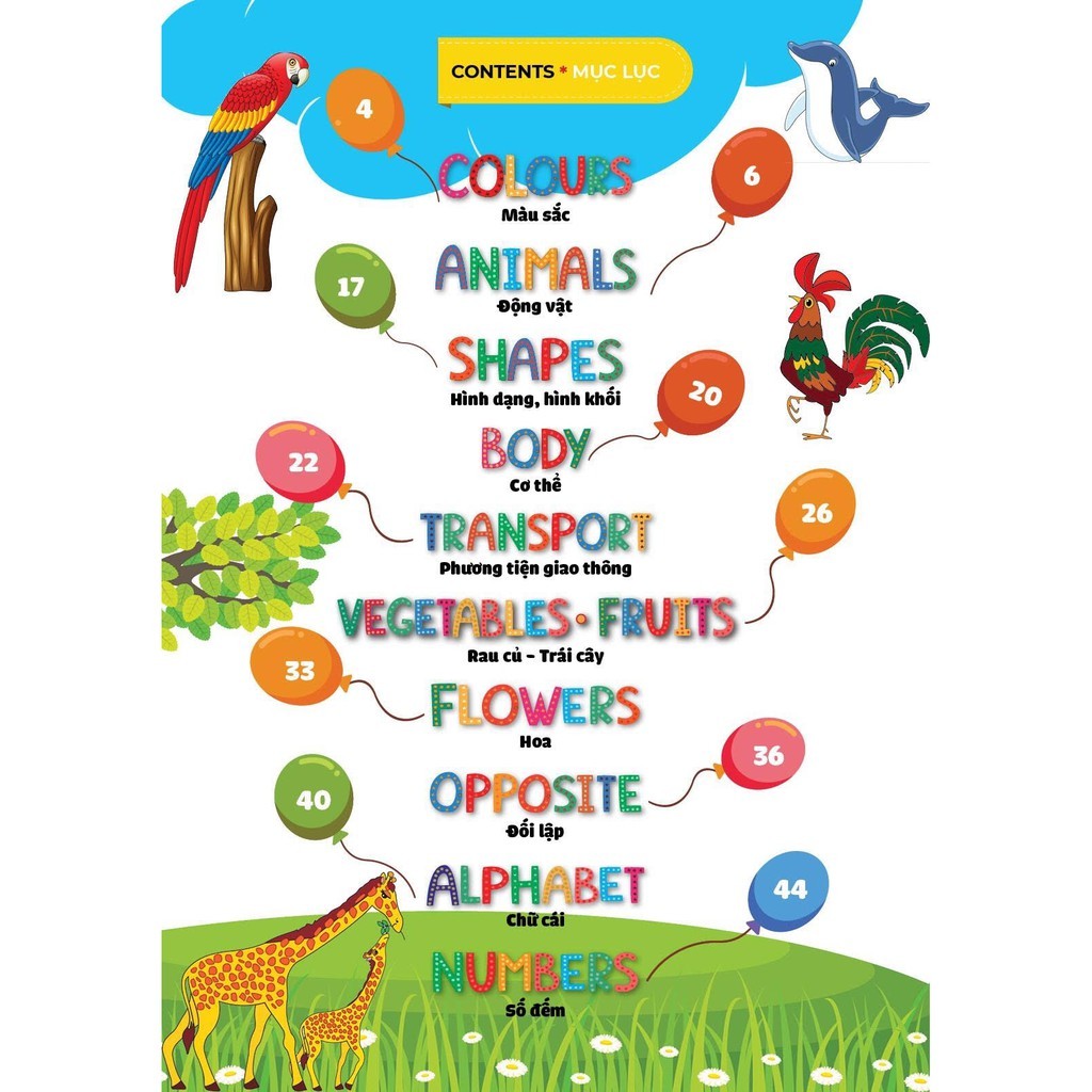 Cuốn sách khổ lớn được thiết kế dưới dạng từ điển bằng hình (song ngữ Việt - Anh) với những hình ảnh minh họa ngộ nghĩnh và ấn tượng về các con vật, cây cối, rau, hoa… giúp bé làm quen với thế giới xung quanh và có những từ vựng đầu tiên làm nền tảng cho giao tiếp và tư duy.