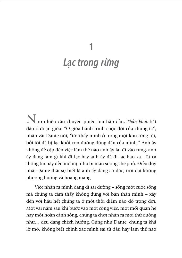 Nội dung sách được chia thành bốn phần, tương ứng với bốn giai đoạn của hành trình mà nhân vật Dante trong tác phẩm “Thần khúc” trải qua: Khu rừng tối lầm lạc, Địa ngục, Luyện ngục và Thiên đường. Thông qua việc kể lại câu chuyện của Dante, tác giả dẫn dắt để người đọc liên hệ với những góc khuất bên trong chính m.ình.