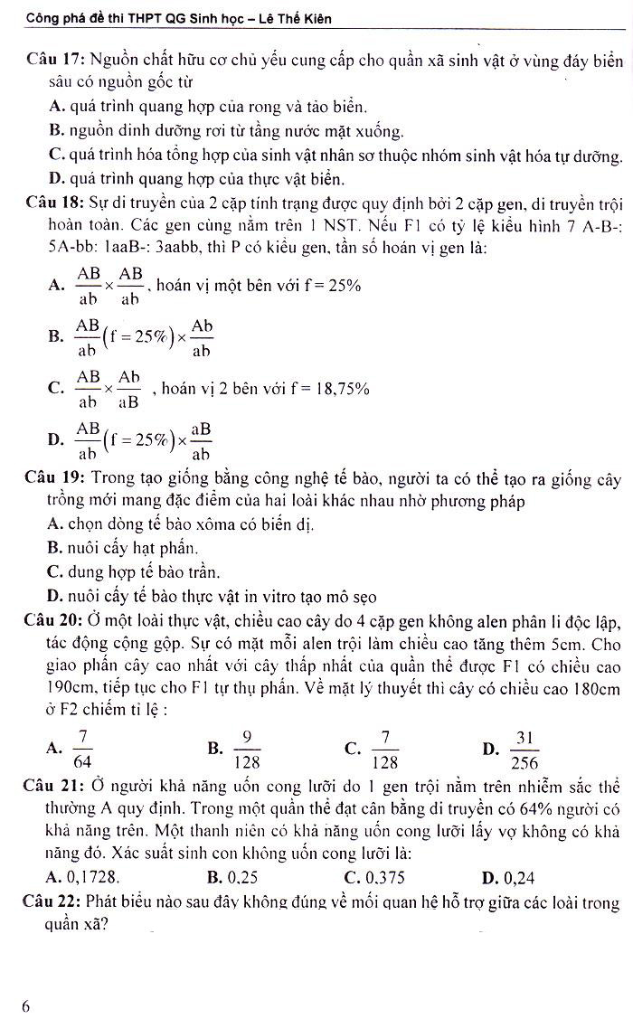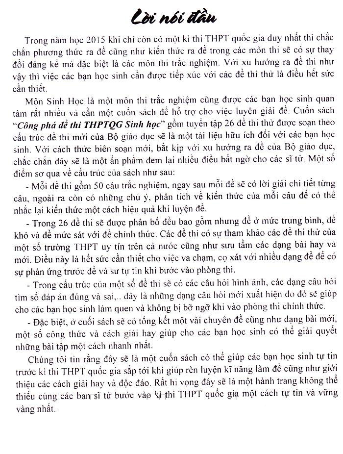 Môn Sinh Học là một môn thi trắc nghiệm cũng được các bạn học sinh quan tâm rất nhiều và cần một cuốn sách để hỗ trợ cho việc luyện giải đề. Cuốn “Công phá đề thi THPTQG Sinh học” gồm tuyển tập 26 đề thi thử được soạn theo cấu trúc đề thi mới của Bộ giáo dục sẽ là một tài liệu hữu ích đối với các bạn học sinh. Với cách thức biên soạn mới, bắt kịp với xu hướng ra đề của Bộ giáo dục, chắc chắn đây sẽ là một ấn phẩm đem lại nhiều điều bất ngờ cho các sĩ tử. Một số điểm sơ qua về cấu trúc của sách như sau: