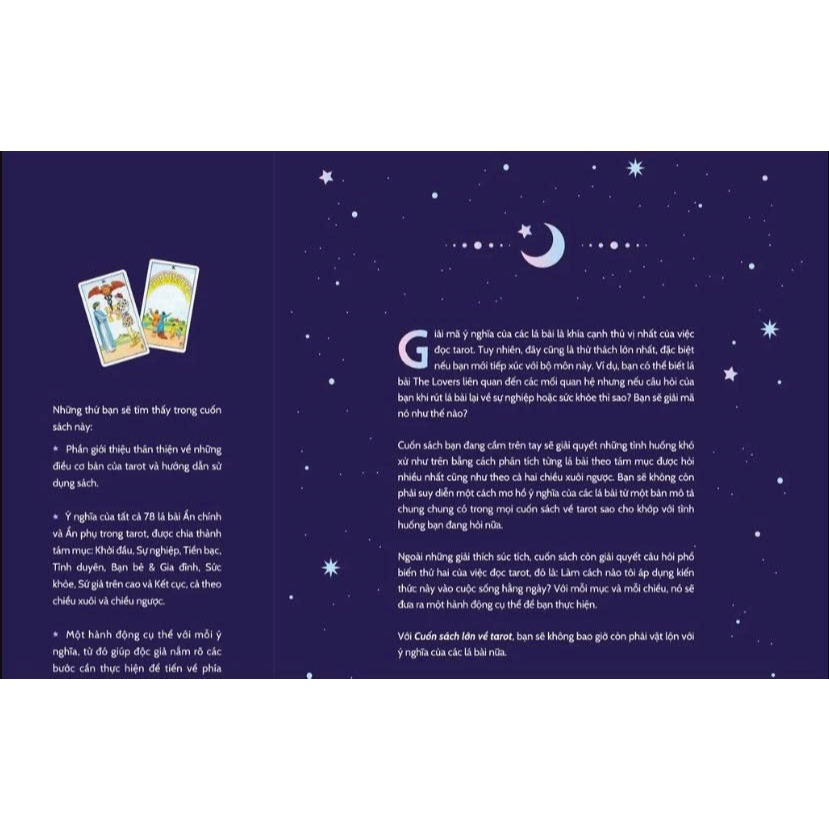 Mô tả: Cuốn Sách Lớn Về Tarot của Sam Magdaleno giải mã ý nghĩa 78 lá bài tarot theo tám mục phổ biến (như tình yêu, sự nghiệp, sức khỏe) và cả hai chiều xuôi-ngược, giúp người mới vượt qua thách thức giải mã. Sách cung cấp giải thích súc tích, hành động cụ thể áp dụng vào cuộc sống hàng ngày, loại bỏ sự mơ hồ khi áp dụng ý nghĩa chung vào tình huống cá nhân.