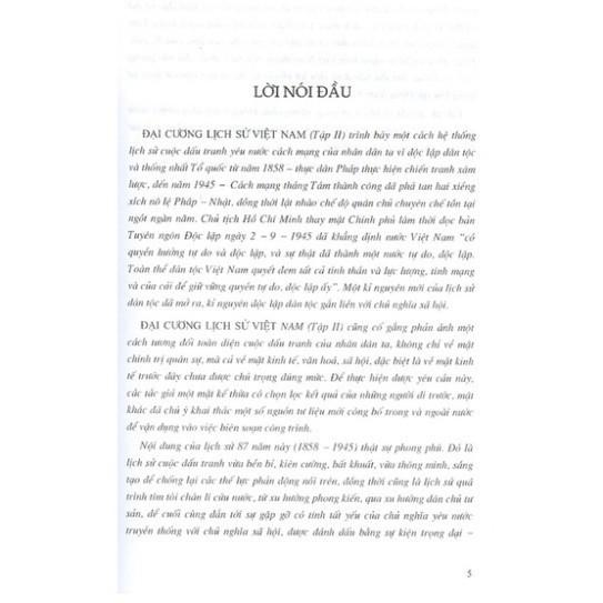 ĐẠI CƯỜNG LỊCH SỬ VIỆT NAM (Tập II) trình bày một cách hệ thống lịch sử cuộc đấu tranh yêu nước cách mạng của nhân dân ta vì độc lập dân tộc và thống nhất Tổ quốc từ năm 1858 – thực dân Pháp thực hiện chiến tranh xâm lược, đến năm 1945 - Cách mạng tháng Tám thành công đã phá tan hai xiềng xích nô lệ Pháp – Nhật, đồng thời lật nhào chế độ quân chủ chuyên chế tồn tại ngót ngàn năm. Chủ tịch Hồ Chí Minh thay mặt Chính phủ lâm thời đọc bản Tuyên ngôn Độc lập ngày 2 – 9 – 1945 đã khẳng định nước Việt Nam “có quyền hưởng tự do và độc lập, và sự thật đã thành một nước tự do, độc lập. Toàn thể dân tộc Việt Nam quyết đem tất cả tinh thần và lực lượng, tính mạng và của cải để giữ vững quyền tự do, độc lập ấy”. Một kỉ nguyên mới của lịch sử dân tộc đã mở ra, kỉ nguyên độc lập dân tộc gắn liền với chủ nghĩa xã hội.