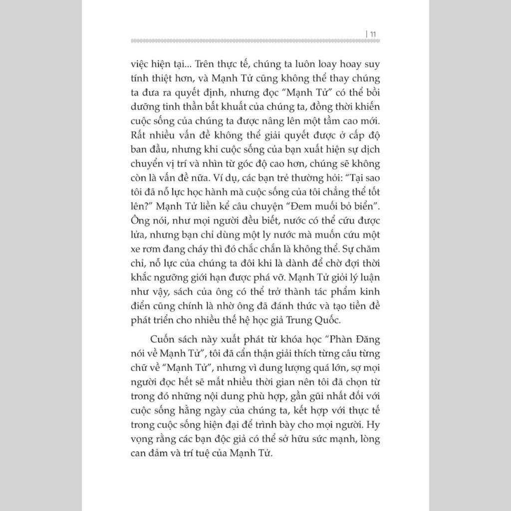Mạnh Tử rất giỏi hùng biện, ông đã giảng một cách thấu đáo và sinh động về mệnh đề rộng lớn là “Tu thân, tề gia, trị quốc, bình thiên hạ”. Đồng thời ông cũng thể hiện được trải nghiệm sâu sắc và nhạy bén trong cách đối nhân xử thế tài tình của mình. Cho dù hiện tại, bạn đang tự mình kiên trì trên đường đời hay tạm thời lạc lối trước bước ngoặt của số phận, bạn sẽ có được phương hướng và dũng khí để tiếp tục tiến về phía trước thông qua cuốn sách này.