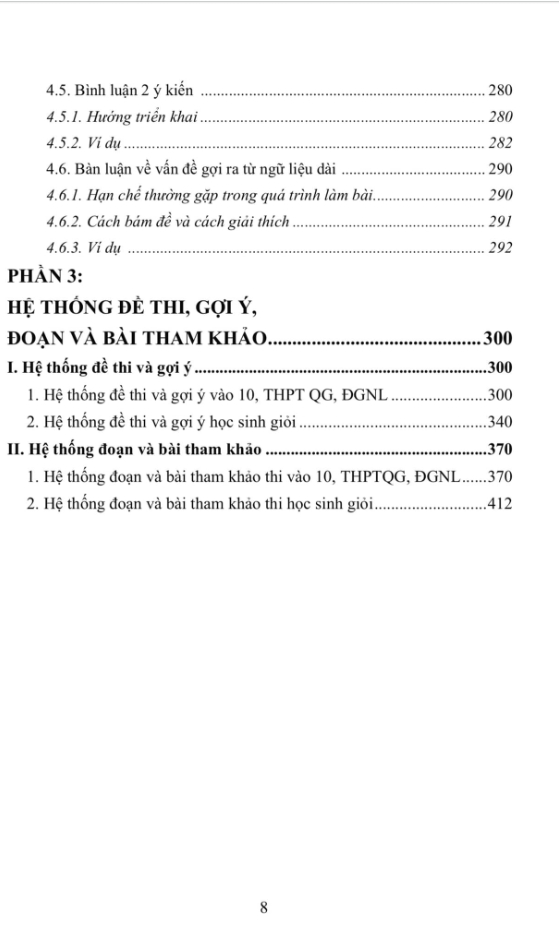 - Kĩ năng diễn đạt 4.1. Diễn đạt đúng 4.2. Diễn đạt hay PHẦN 2: CHUYÊN ĐỀ CƠ BẢN VÀ NÂNG CAO 2.1. Chuyên đề cơ bản 2.1.1. Tác phẩm trữ tình 2.1.2. Tác phẩm tự sự 2.1.3. Kí văn học 2.1.4. Văn học kịch 2.2. Chuyên đề nâng cao 2.2.1. Thơ trữ tình Việt Nam: loại hình và phát triển 2.2.2. Luân lí đạo đức trong văn học: truyền thống và hiện đại 2.2.3. Nữ quyền sinh thái: phản tư về những vấn đề xã hội 2.2.4. Tiếp nhận văn học: kiến tạo những giá trị 2.2.5. Văn học so sánh: cái nhìn đa chiều về văn học PHẦN 3: HỆ THỐNG ĐỀ THI, GỢI Ý, ĐOẠN VÀ BÀI THAM KHẢO