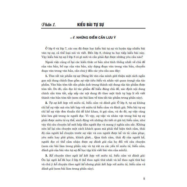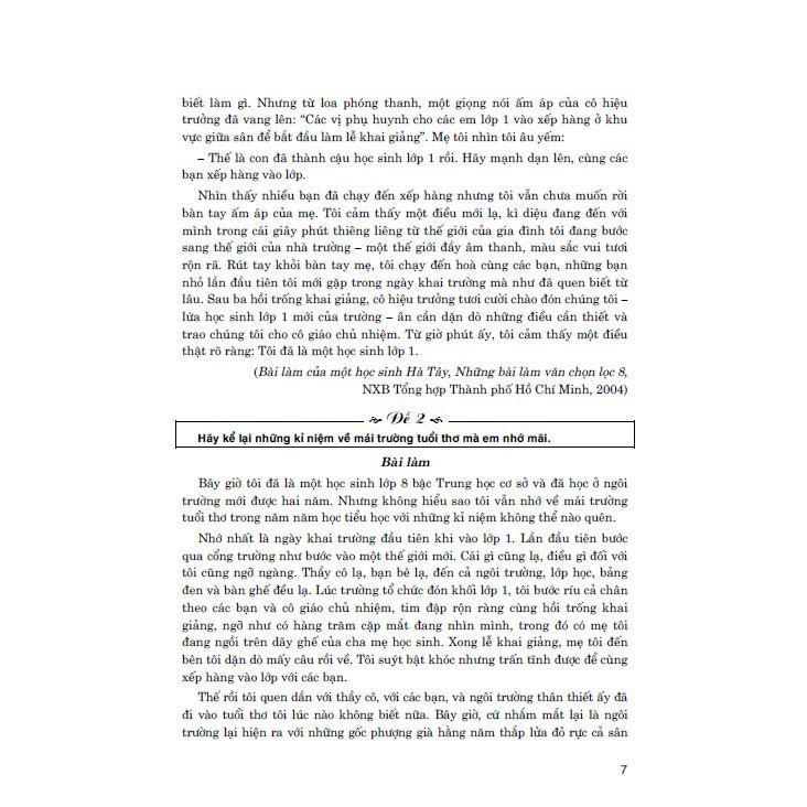 Cuốn sách gồm những bài làm văn tiêu biểu (tự sự: 20 bài; thuyết minh: 19 bài và 2 đoạn văn; nghị luận: 21 bài; tường trình: 2 bài, thông báo: 2 bài) được tuyển chọn theo các tiêu chí: sát hợp với Chương trình giáo dục phổ thông 2018, tích hợp phần Văn, vừa sức với học sinh lớp 8, đa dạng về nội dung cũng như dạng bài.