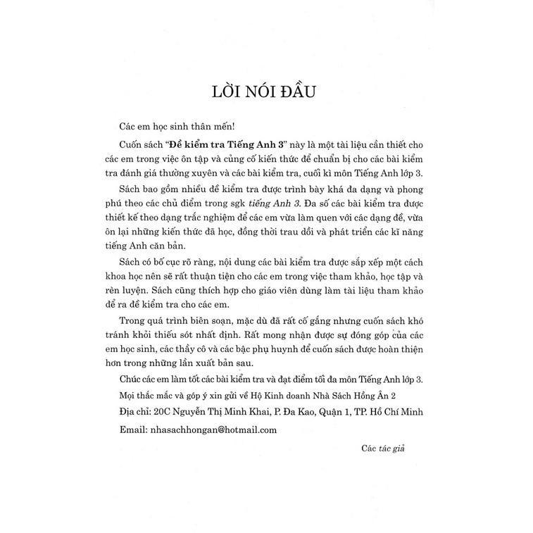Cuốn sách Đề Kiểm Tra Tiếng Anh 3 - Có Đáp Án (Biên Soạn Theo Chương Trình GDPT Mới) này là một tài liệu cần thiết cho các em trong việc ôn tập và củng cố kiến thức để chuẩn bị cho các bài kiểm tra đánh giá thường xuyên và các bài kiểm tra, cuối kì môn Tiếng Anh lớp 3.