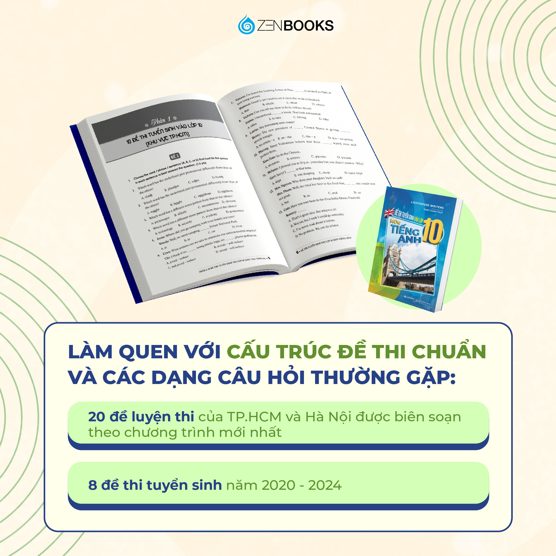 Mua tại TiktokĐề Thi Tuyển Sinh Vào Lớp 10 Môn Tiếng Anh (Có Đáp Án) Tác giả: Trịnh Thanh Thủy Công ty phát hành: Zenbooks Nhà xuất bản: Thế giới Năm xuất bản: 2025 Giới thiệu về sách Đề Thi Tuyển Sinh Vào Lớp 10 Môn Tiếng Anh Đề Thi Tuyển Sinh Vào Lớp 10 Môn Tiếng Anh (Có Đáp Án) là tài liệu ôn luyện lý tưởng cho học sinh lớp 9 trong giai đoạn nước rút trước kỳ thi vào lớp 10. Cuốn sách tổng hợp các đề thi bám sát cấu trúc chính thức, giúp học sinh làm quen với dạng đề, nâng cao kỹ năng và tự tin bước vào kỳ thi quan trọng này. Nội dung nổi bật của sách