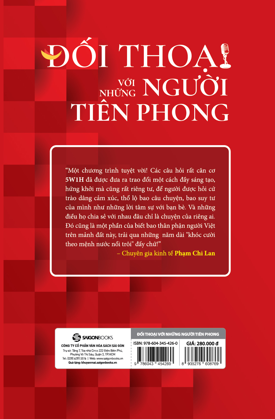 Thông tin xuất bản: Tác giả : Nhà báo Kim Hạnh Công ty phát hành : Saigon Books Mã sản phẩm : 8935278608769 Nhà xuất bản : NXB Thế Giới Năm xuất bản : 2024 Kích thước: 15.5 x 23.5 cm Số trang : 404     Đối Thoại Với Những Người Tiên Phong   Cuốn sách khai phóng tiềm năng cho giới trẻ Việt Nam Người gần 3 thập kỷ đồng hành cùng ngành hàng Việt   Bà Vũ Kim Hạnh từng là Tổng Biên tập và là một trong những người đầu tiên xây dựng báo Tuổi Trẻ Thành phố Hồ Chí Minh thành tờ báo hàng đầu Việt Nam. Sau khi rời báo Tuổi Trẻ, bà Kim Hạnh hiện là Chủ tịch Hội Doanh nghiệp Hàng Việt Nam Chất lượng cao và Giám đốc Trung tâm Nghiên cứu kinh doanh và Hỗ trợ doanh nghiệp (BSA).   Sau khi về hưu chính thức, bà thành lập trung tâm xúc tiến thương mại tư nhân đầu tiên của Việt Nam với tên gọi Trung tâm Nghiên cứu Kinh doanh và Hỗ trợ Doanh nghiệp. Từ BSA, bà Kim Hạnh cùng cộng đồng những doanh nghiệp Hàng Việt Nam Chất lượng cao tiên phong lập nên Câu lạc bộ các doanh nghiệp dẫn đầu (LBC) một tổ chức tập hợp những doanh nhân hàng đầu Việt Nam với nhiều hoạt động xúc tiến, hỗ trợ doanh nghiệp và thiện nguyện.   Là người đã đồng hành với Hàng Việt Nam chất lượng cao trong mấy chục năm kể từ khi chương trình này được khởi động trên báo Sài Gòn Tiếp thị năm 1996. Bà Kim Hạnh vẫn còn nhiều trăn trở về tương lai của hàng Việt trong bối cảnh thương mại toàn cầu. Những năm gần đây, cùng với Hội, BSA và Câu lạc bộ LBC, bà Kim Hạnh xây dựng phong trào thúc đẩy thanh niên khởi nghiệp, sản xuất theo chuẩn, sản xuất xanh để hội nhập sâu rộng vào thị trường thế giới.   Đối Thoại Với Những Người Tiên Phong - Cuốn sách truyền cảm hứng cho giới trẻ Việt