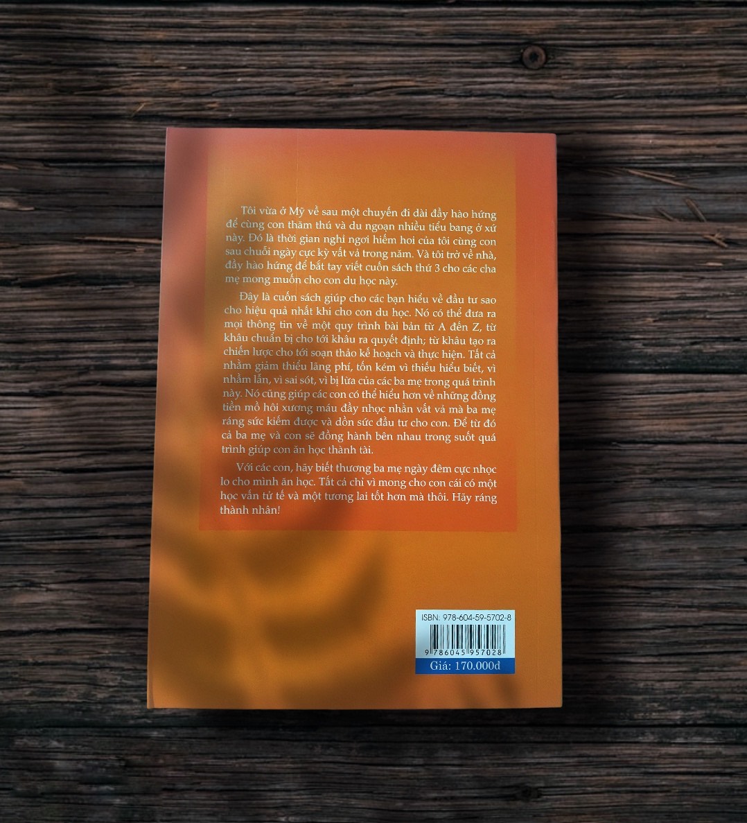 Đây là cuốn sách giúp cho các bạn hiểu về đầu tư sao cho hiệu quả nhất khi cho con du học. Nó có thể đưa ra mọi thông tin về một quy trình bài bản từ A đến Z, từ khâu chuẩn bị cho tới khâu ra quyết định; từ khâu tạo ra chiến lược cho tới soạn thảo kế hoạch và thực hiện. Tất cả nhằm giảm thiểu lãng phí, tốn kém vì thiếu hiểu biết, vì nhầm lẫn, vì sai sót, vì bị lừa của các ba mẹ trong quá trình này. Nó cũng giúp các con có thể hiểu hơn về những đồng tiền mồ hôi xương máu đầy nhọc nhằn vất vả mà ba mẹ ráng sức kiếm được và dồn sức đầu tư cho con. Để từ đó, cả ba mẹ và con sẽ đồng hành bên nhau trong suốt quá trình giúp con ăn học thành tài.