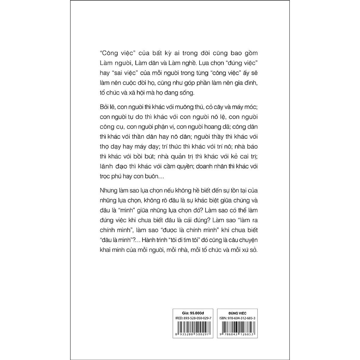 Đúng Việc là con đường cho mọi đổi thay có tính cách mạng. Đúng Việc đề cập đến những vấn đề căn cơ và nền tảng nhất của con người, đó là: làm người (đạo nhân), làm mình (đạo sống), làm dân (đạo dân) và làm nghề (đạo nghề) bằng văn phong dí dỏm, súc tích và có tính hệ thống cao. Từ đó, sách đưa ra phương pháp luận để mỗi người tự thấu hiểu bản thân, tự tìm ra đường đời của mình, hình thành đạo nhân, đạo sống và đạo nghề của riêng mình. Hay nói cách khác, “Đúng Việc” là một phương pháp luận để góp sức cho mỗi người, mỗi nhà, mỗi tổ chức và mỗi xứ sở trên hành trình tự tìm ra “đích đến” và “con đường” cho sự đổi thay có tính cách mạng của riêng mình.