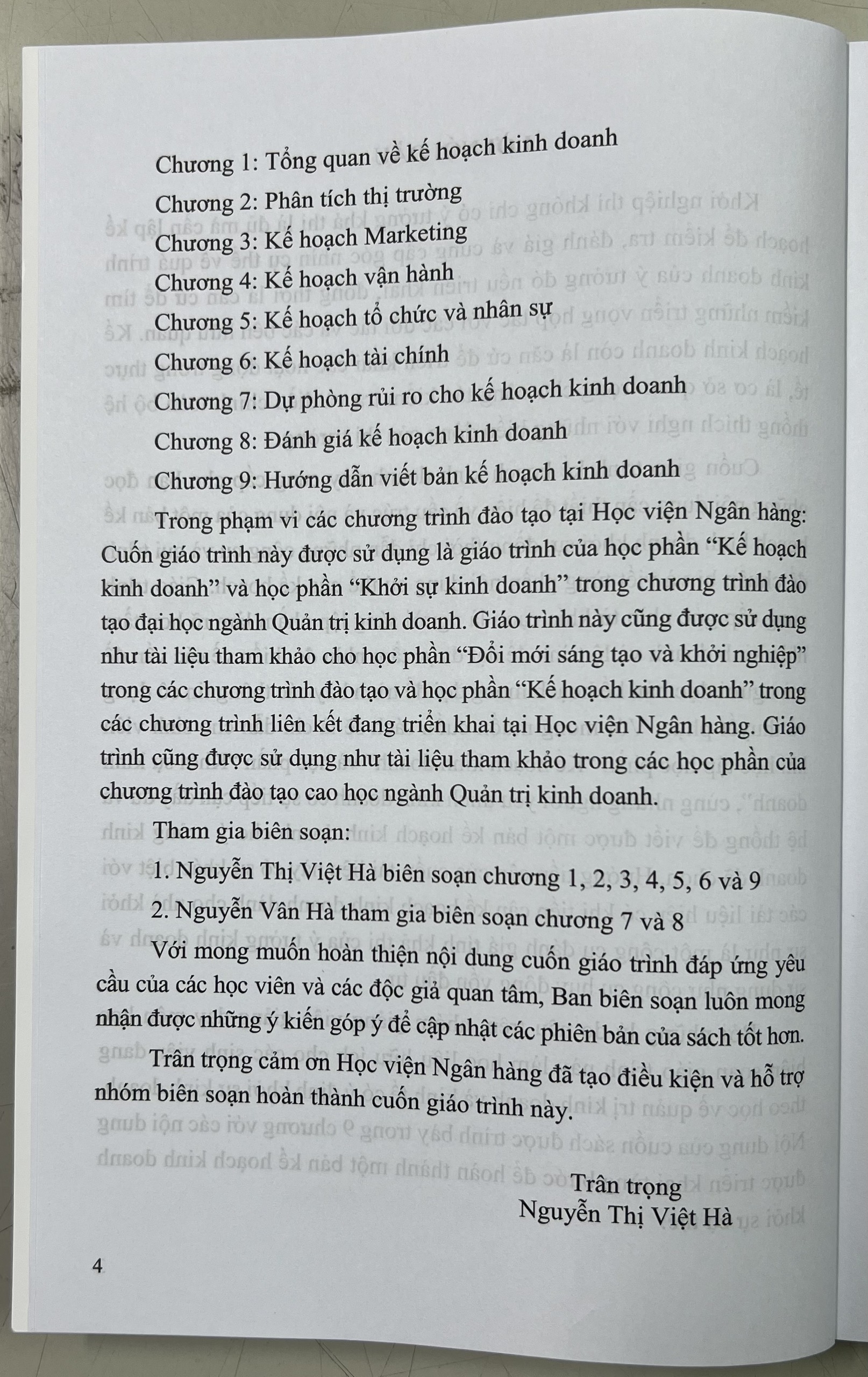 Cuốn giáo trình kế hoạch kinh doanh này cung cấp cho bạn đọc những nội dung cần thiết để hiểu về cấu trúc và nội dung của một bản kế hoạch kinh doanh khởi sự, đồng thời chỉ dẫn những công cụ và qui trình để chuẩn bị và viết từng phần nội dung cụ thể của kế hoạch. Giáo trình cung cấp góc nhìn từ khía cạnh là người sáng lập nhằm làm rõ hơn tầm nhìn kinh doanh và lộ trình để đạt được tầm nhìn đó, hiểu về các vấn đề mà người đọc bản kế hoạch mong đợi để trình bày các thông tin cô đọng và thuyết phục. Với mong muốn cuốn sách sẽ là chỉ dẫn cho sinh viên khi học tập học phần “Kế hoạch kinh doanh” và học phần “Khởi sự kinh doanh”, cùng những người yêu thích kinh doanh có sự tiếp cận đầy đủ và hệ thống để viết được một bản kế hoạch kinh doanh cho ý tưởng kinh doanh đã chọn. Hướng tiếp cận của cuốn tài liệu này có sự khác biệt với các tài liệu hiện có khi tiếp cận kế hoạch kinh doanh dành cho nhà khởi sự như là một công cụ đánh giá tính khả thi của ý tưởng kinh doanh và sử dụng như công cụ huy động vốn đầu tư. Bởi những lý do nêu trên, nhóm giảng viên giảng dạy môn học biên soạn giáo trình này làm học liệu hữu ích cho các sinh viên đang theo học về quản trị kinh doanh và kinh tế có ý định khởi sự kinh doanh. Nội dung của cuốn sách được trình bày trong 9 chương với các nội dung được triển khai từng bước để hoàn thành một bản kế hoạch kinh doanh khởi sự cụ thể:
