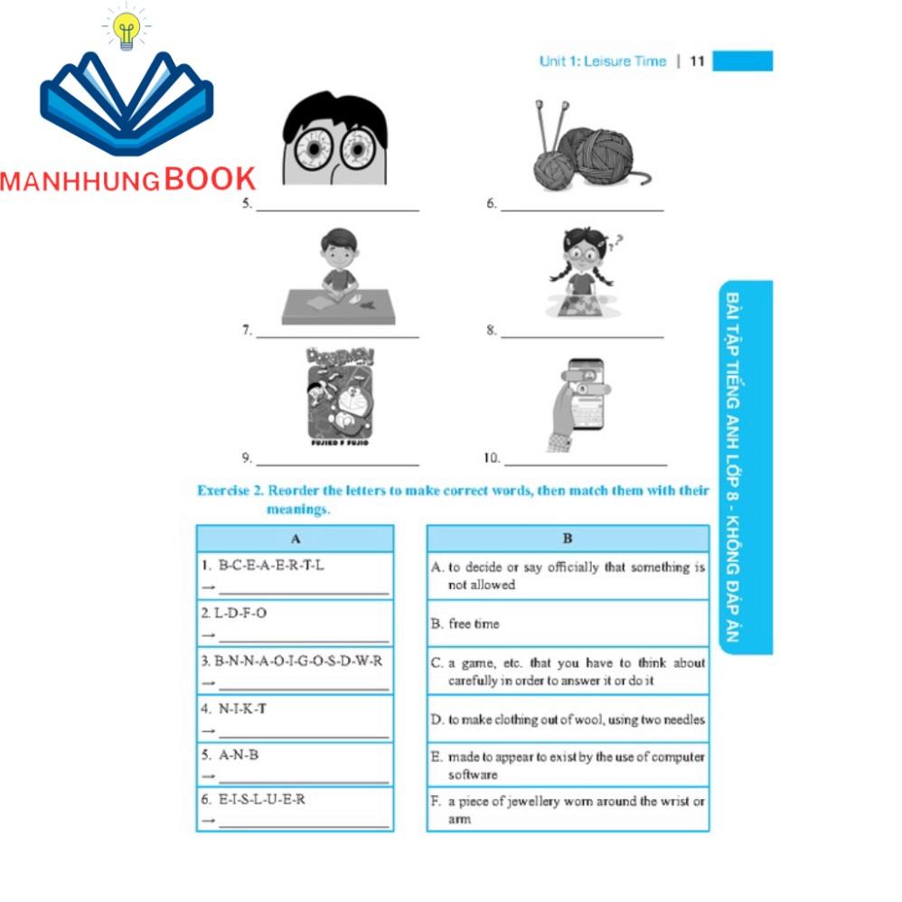 “BÀI TẬP TIẾNG ANH LỚP 8” với các dạng bài tập phong phú, đa dạng, bám sát ngữ pháp và từ vựng theo chủ đề từng đơn vị bài tập.